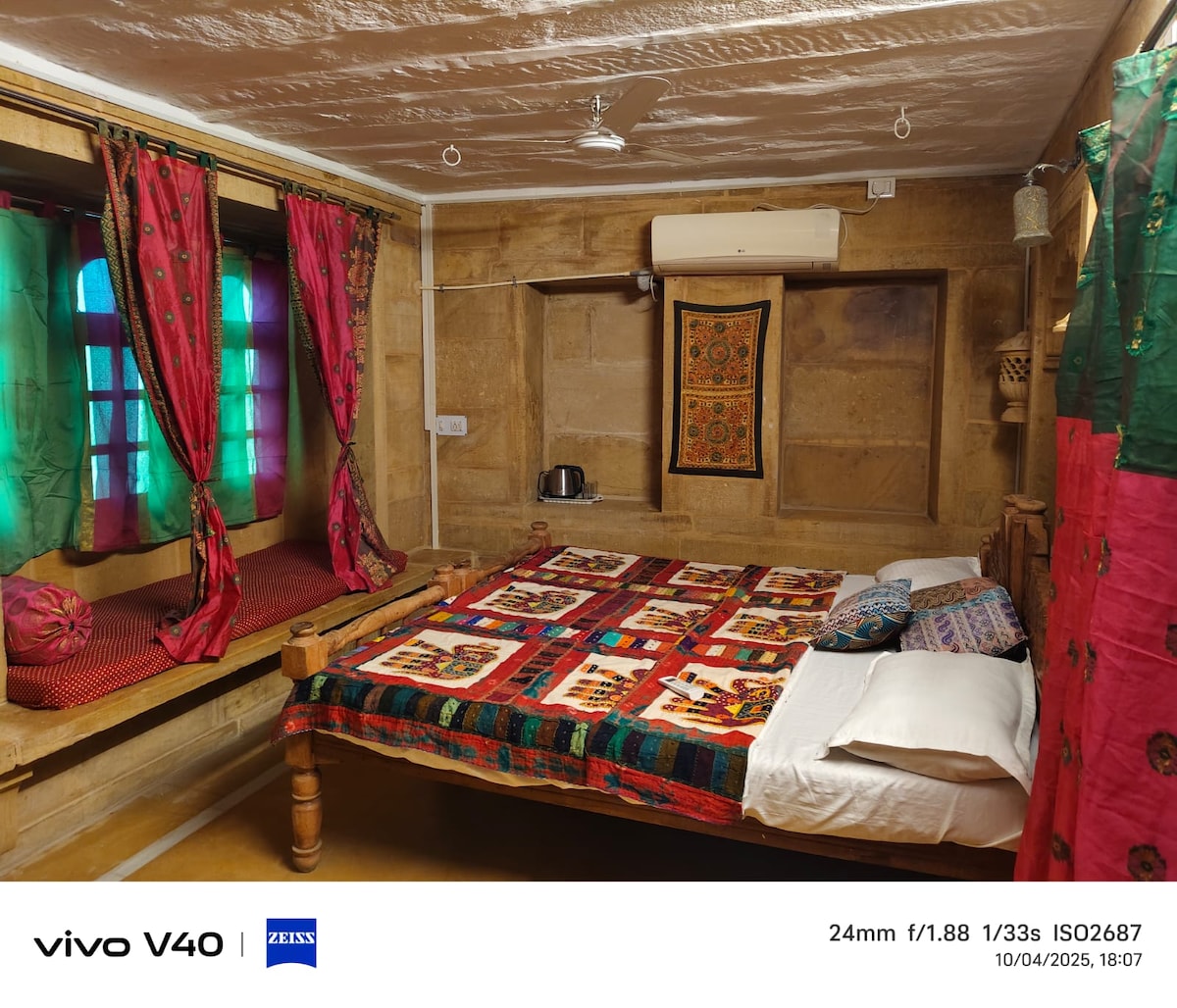 Stay in our spacious & beautifully decorated room, perfect for 2 or 3 guests. Enjoy elegant décor with block-printed curtains, handmade fabrics, and a warm white ambiance which creates traditional Rajasthani vibe. Features include a cozy soft bed, large bathroom, and traditional stone jharokha. Common spaces are bonus. We pride ourselves on cleanliness, warm hospitality, and delicious food. Located in the heart of Jaisalmer. We also arrange local sightseeing, desert safaris, & magical dune stay