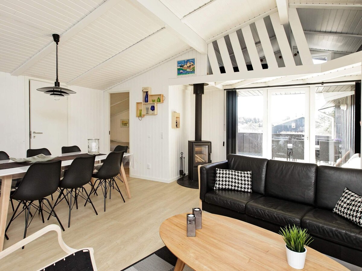 Unique and well-equipped 90 m2 year-round residence + electric charger for electric car. Incl. electricity consumption for water, underfloor heating in the bathroom + wood-burning stove and cleaning. Furnishing: Living room, kitchen, 3 bedrooms, 6 beds (3 double beds), sloping ceiling, 55' Smart-TV, 3 open terraces on hilly natural grounds with sea view and 350 meters to a beautifull bathing-friendly beach with fine corned white sand. The area offers MTB routes, paths and varied wildlife.