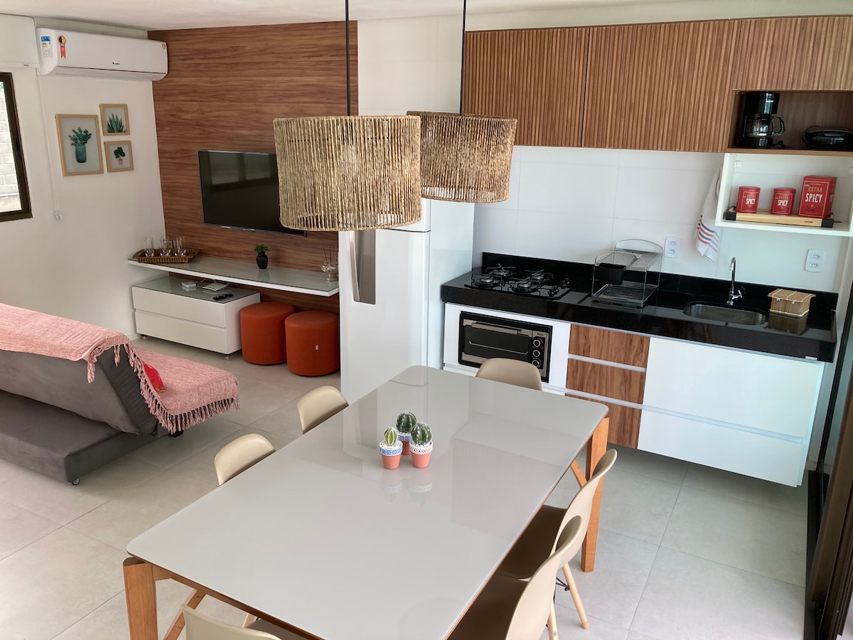 ¡Inspírese con familiares y amigos en este lugar lleno de estilo y diseño! ¡Nuestra casa está equipada y completa para recibir a sus invitados y hacer de su estancia una experiencia inolvidable! Nuestra piscina climatizada tiene una zona poco profunda perfecta para los niños e iluminación nocturna. A 200 metros de la paradisíaca playa de Tatuamunha y también del río, hermoso escenario del Pez Boi - delicioso desayuno, servido todos los días, - limpieza diaria