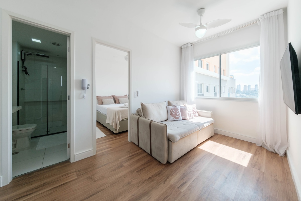 Estudio súper nuevo y confortable. Gran lugar para hospedarte. Junto a varios puntos de interés. Piso alto, sol matutino, frente a la piscina. Cuenta con aire acondicionado, TV de 43 pulgadas, wifi, refrigerador, estufa, lavavajillas, microondas, cafetera, freidora de aire, sándwichera, plancha, muchos armarios, oficina y cerradura digital. Condominio completo con gimnasio, piscina, lavandería, salas de juegos, coworking y tienda de comestibles. Junto al metro G.Gronchi y Carrefour. No hay espacio de estacionamiento.