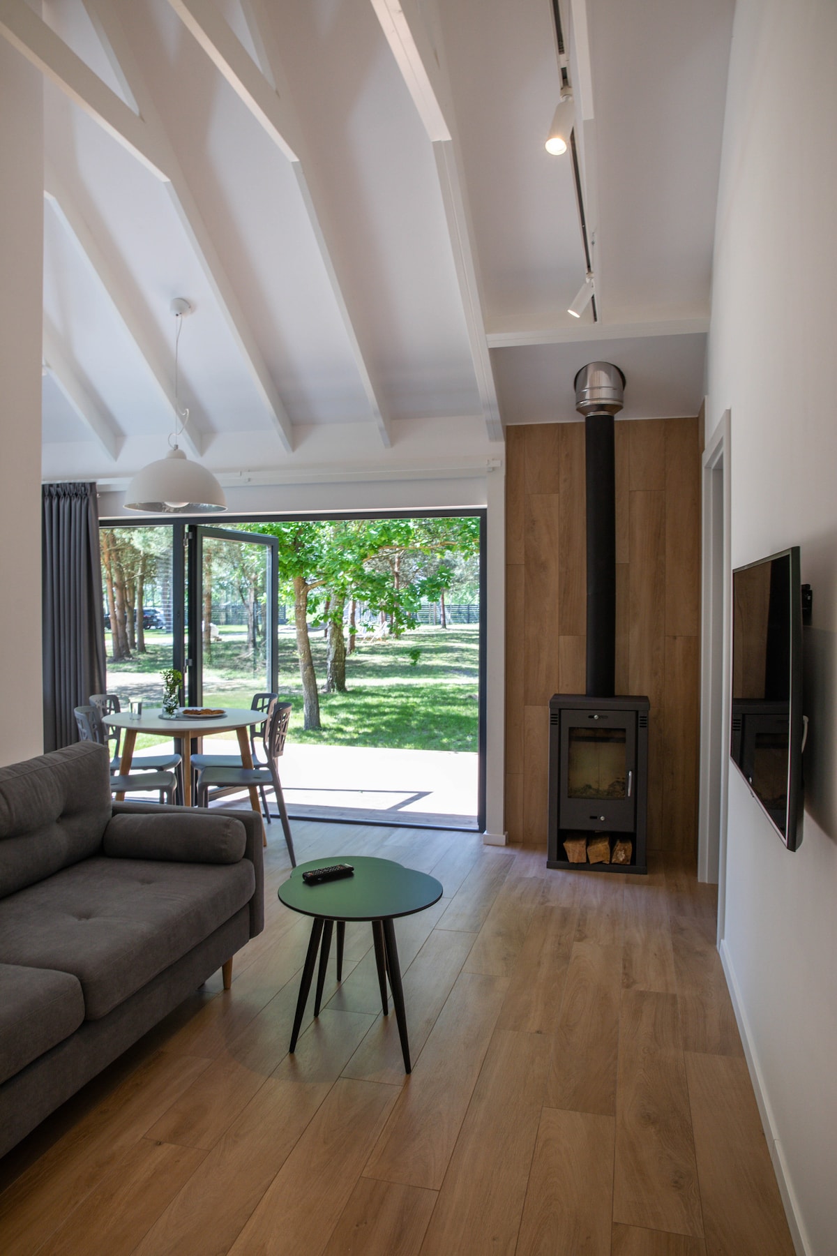 Ofrecemos una nueva y amplia casa de campo con una superficie de unos 50 m2, puesta en servicio en julio de 2021. La casa está equipada con todos los electrodomésticos necesarios. En la planta baja hay un salón con cocina americana, baño y una gran terraza, en la entreplanta hay 1 cama de matrimonio y 3 camas individuales. En la propiedad de 15 acres hay 3 casas, un parque infantil, una cama elástica y un aparcamiento. La casa está vallada con una valla de 1 metro de altura. Se admiten mascotas. En las inmediaciones se encuentra el Parque Nacional de Słowiński.