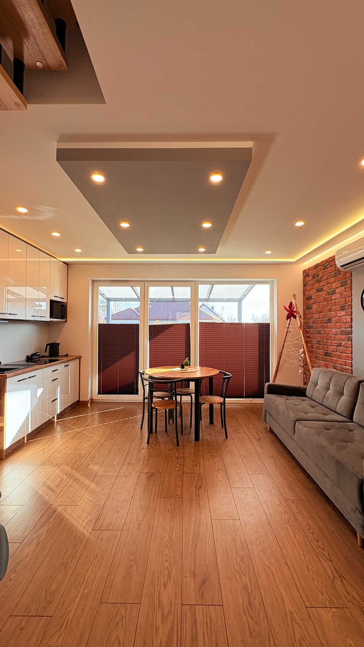 Cómoda casa de 74 metros cuadrados con zona de SPA privada (jacuzzi y sauna seca, exclusiva, sin cargos adicionales). Una parcela vallada te da la sensación de tener tu propio espacio y privacidad. 2 dormitorios (cada dormitorio tiene una cama de 160x200 cm y un sofá cama de 120x190 cm). La ventana panorámica de uno de los dormitorios ofrece una hermosa vista. El patio tiene una parrilla de gas, una mesa grande y 6 sillas, y una cómoda mecedora. Tumbonas y pantalla de playa. Dos plazas de estacionamiento.