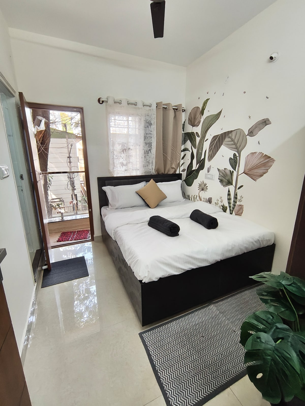 This peaceful and centrally located Private Suite room with small Pantry - Perfect for Couples, Families or Business Stays Enjoy a comfortable stay in this stylish private suite featuring a terrace garden, perfect for relaxing after a busy day. The space includes a 43 inch Smart TV, high-speed Wi-Fi, and a work desk with chairs, ideal for both leisure and work. Kitchen is equipped with a microwave, toaster, kettle, induction cooktop & minibar, making it easy to prepare light snacks only.