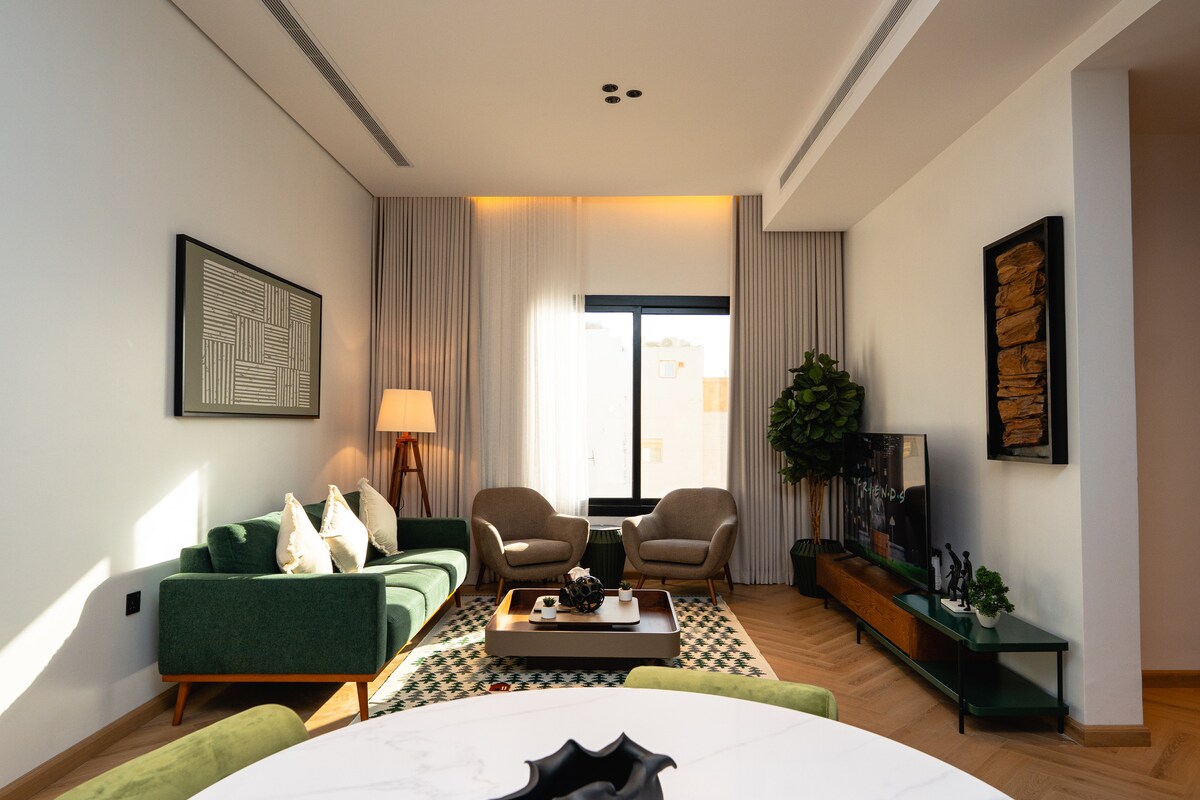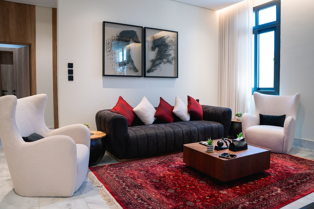 - Lujo y elegancia: un diseño interior elegante y un ambiente acogedor con muebles de lujo y decoraciones modernas. - Limpieza y esterilización: especial atención a la limpieza y esterilización después de la salida de cada cliente para garantizar la comodidad de los huéspedes. - Entretenimiento: TV de 75 pulgadas con Netflix y Shahid, y un moderno sistema de sonido para una experiencia de entretenimiento completa. - Comodidades: todos los suministros están disponibles, incluidos una variedad de juegos y una máquina de café para una estancia agradable. Disfruta de una estancia inolvidable en nuestro exclusivo apartamento, donde la comodidad y la elegancia se unen en un mismo espacio.