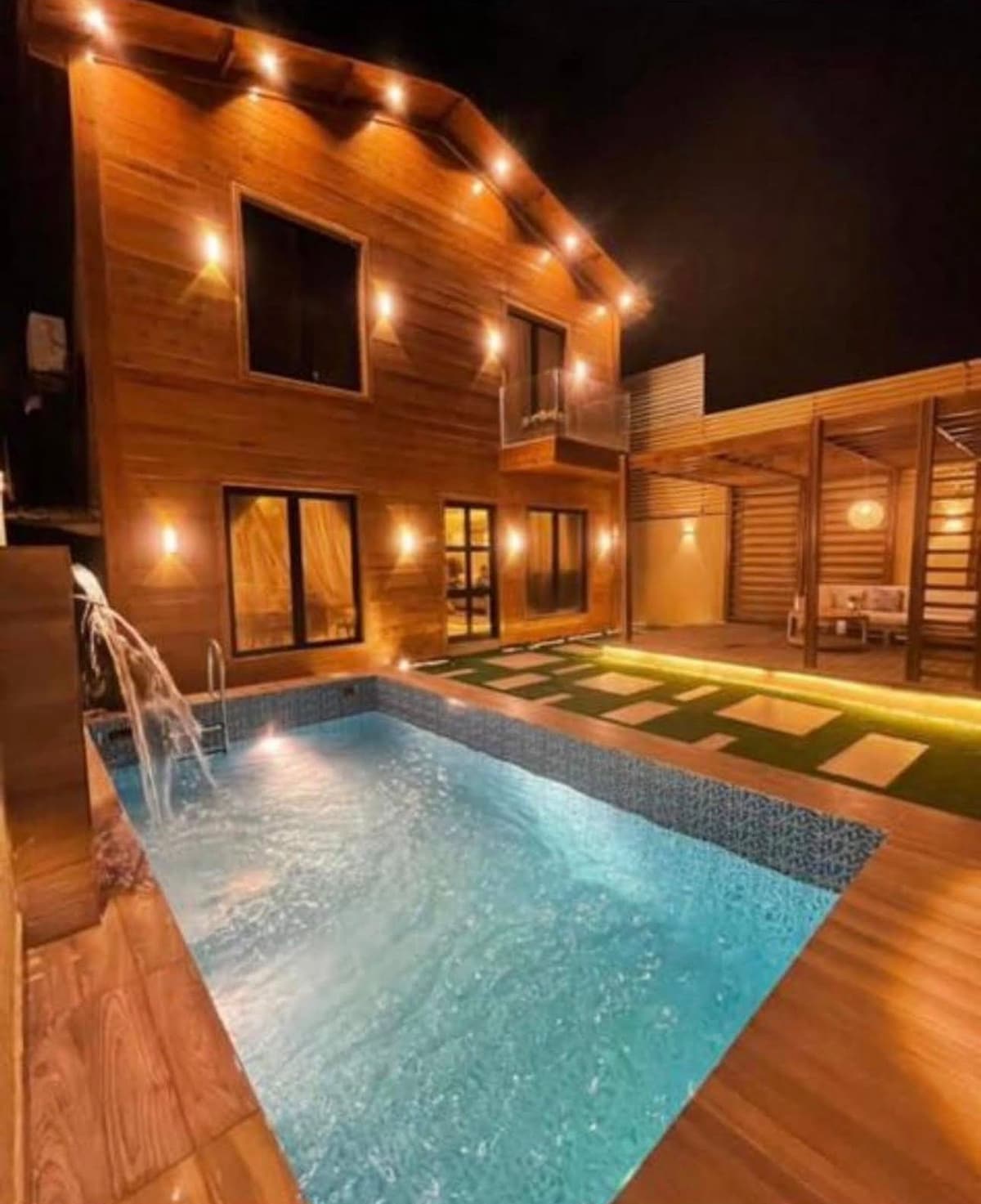 A small Chalet with a 2 bed rooms and 2 bathrooms And one living room and a swimming pool surrounded with a small green landscape With a smart self entrance And its located in obhur