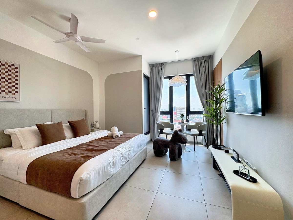 Una SUITE DELUXE CON VISTAS AL MAR en la ubicación PERFECTA Encantadora y acogedora suite con vistas al mar con NETFLIX, wifi de alta velocidad y DISPENSADOR DE AGUA POTABLE ubicada a solo unos kilómetros del centro de la ciudad y del sitio del Patrimonio Mundial de la UNESCO. A pie: - Restaurante japonés/coreano/tienda de comestibles 7-11 las 24 horas en las instalaciones, planta baja. - Puestos de comida, restaurantes, supermercado y mercado húmedo. En coche: A 5 km: sitio Patrimonio de la Humanidad de la UNESCO/G'Town. A 6 km: Gurney Drive. A 8 km del centro comercial Queensbay. 14 km - Aeropuerto Internacional 16 km - Playa de Batu Ferringhi