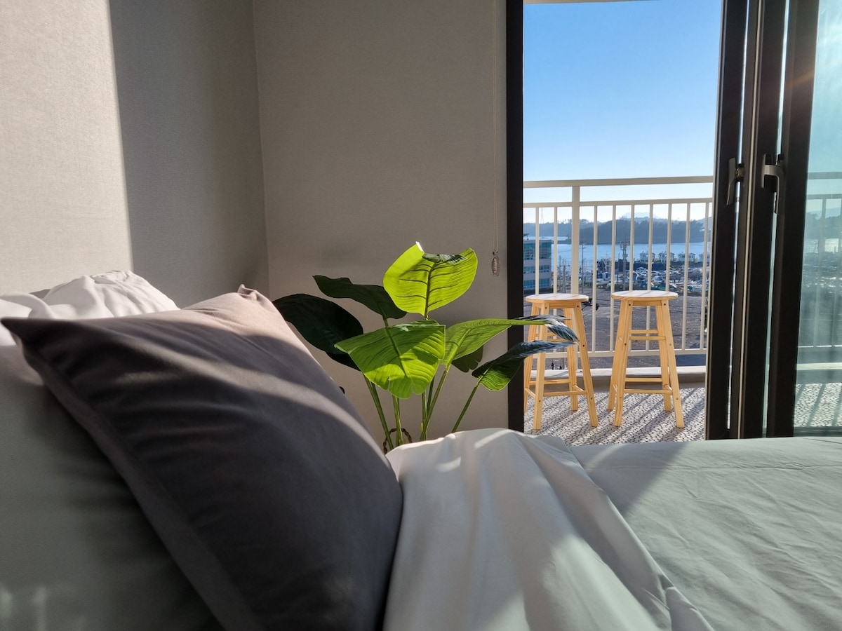 (Precio especial) # Terraza con vista al mar/puerto deportivo/Estación Yeocheon 10 minutos/1 minuto a pie Mart/habitación para 3 personas (2 camas)/Limpieza moderna/Estacionamiento gratuito