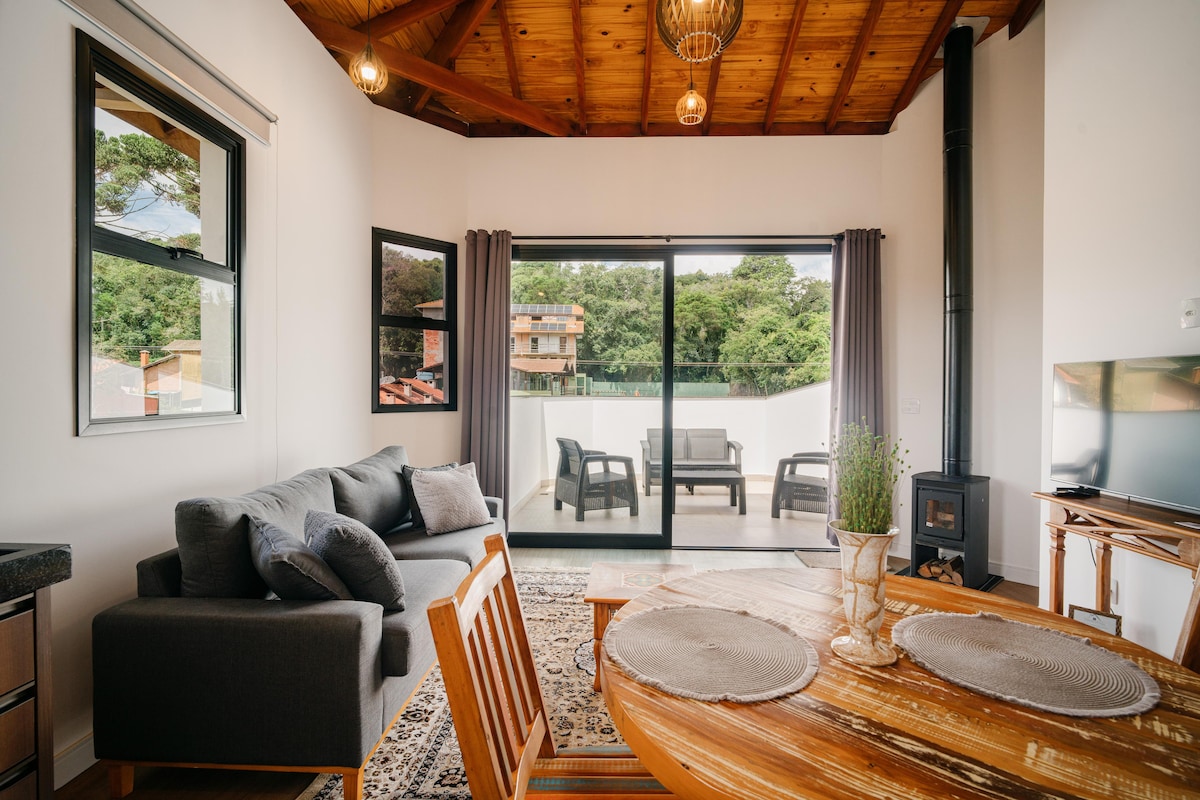 Casinha de Cima es un acogedor loft de 40 metros cuadrados. Está a 6 km/15 min de la ciudad y a 1053 metros sobre el nivel del mar. Tiene una vista exuberante, frente a la presa de Jaguari y Serra da Mantiqueira. Independiente, tiene balcón, dormitorio + salón + cocina en la misma habitación + baño + zona exterior: ducha, hamaca y barbacoa. Ideal para descansar, trabajar, disfrutar de la naturaleza y pasear. El wifi/internet de fibra óptica garantiza una gran conexión. A solo 1:30 horas de São Paulo. Paraíso en la tierra <3