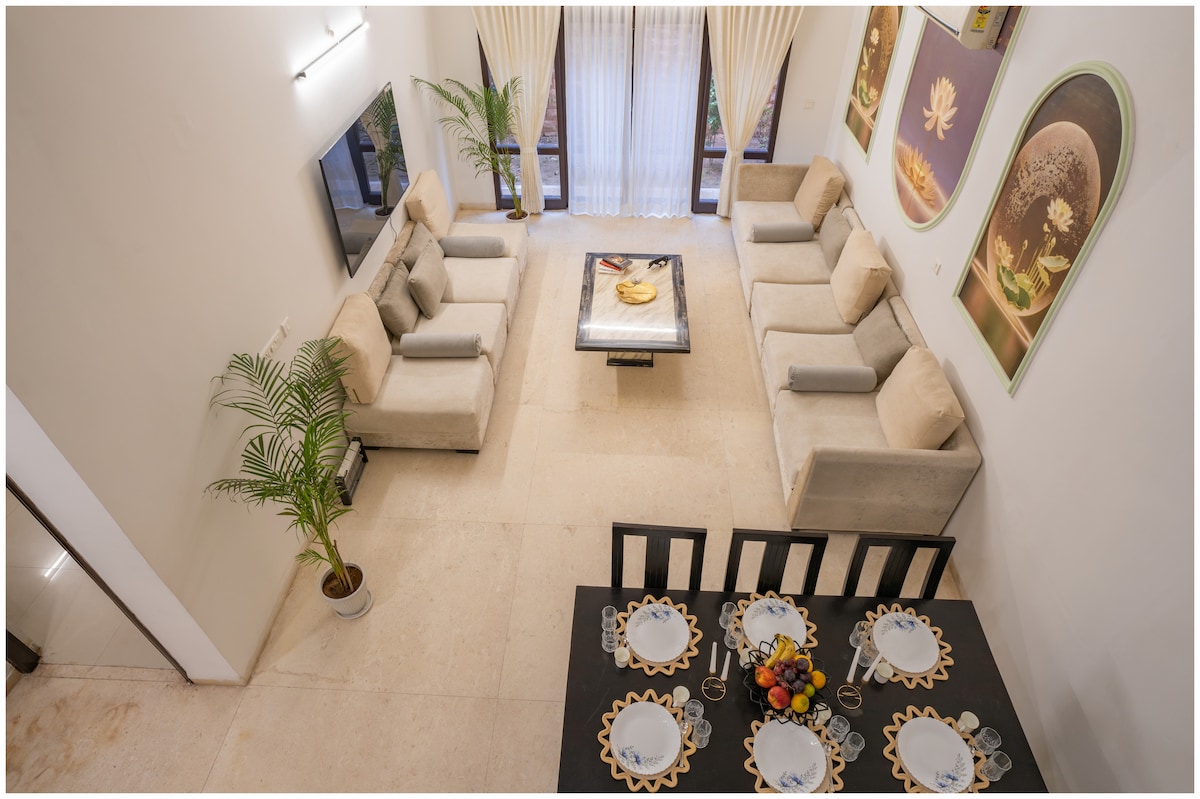 ¡Presentamos el Retiro Royale Haveli By Madvik en Rajasthan! Déjate llevar por la magia del patrimonio dorado y la cultura de Jodhpur. El haveli es un alojamiento de 3BHK con todos los servicios modernos y la comodidad. Puedes disfrutar del cielo abierto junto a la piscina o relajarte junto al área del jardín a la voz de los pájaros a distancia. Se han visto muchas aves y pavos reales en la zona de terraza y jardín de este haveli. Reserva tu estadía y mimate con la deliciosa comida y la increíble hospitalidad de nuestro personal