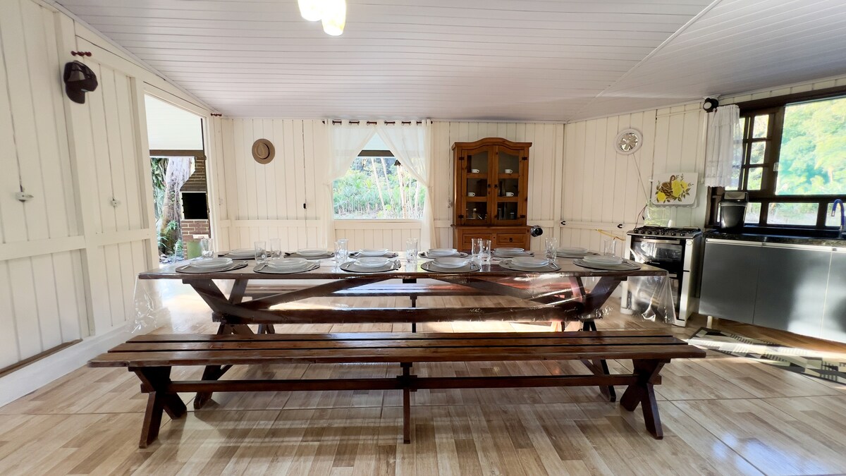 ¡Disfruta de la tranquilidad en la colina de Río da Prata en Pirabeiraba, Joinville! Con 7 habitaciones dobles y 1 dormitorio con 4 camas individuales, nuestra propiedad ofrece una piscina climatizada, capilla (parte de reserva), estufa de leña, arroyo, lagos, fogata, senderos, campo de fútbol, voleibol, piscina y mucha zona verde. Exclusividad garantizada para tu grupo. - Calendario completo para 2026 abierto @ColinaRioDaPrata