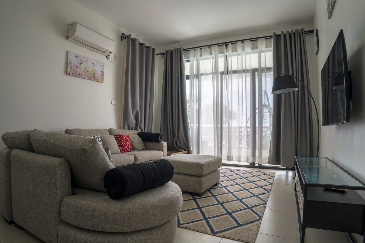 Acogedor apartamento estudio con servicios (Bamburi) amueblado. * Adecuado para 2 adultos y 1 niño o 3 adultos, amueblado con una cama tamaño queen y una cama individual. * Incluye aseo diario. * Mesa de comedor con cuatro sillas, sofá, mesa de centro. * Aire acondicionado *TV * Caja fuerte con llave * Balcón con dos sillas y mesa de centro * Cocina: nevera, microondas, hervidor de agua, cafetera, tostadora, vajilla y cubiertos. * Acceso a servicios: piscina, zona de juegos para niños, bar de playa, restaurante, gimnasio, playa, lavandería. * A 21 km del aeropuerto internacional de Moi. * A 26 km de SGR Mombasa.