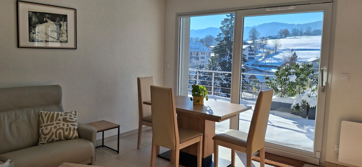 Disfrute de unas vistas impresionantes de nuestra hermosa región desde el balcón de este elegante apartamento bien equipado y funcional. Situado en una residencia tranquila, estarás a pocos minutos de la estación de Métabief, pistas de esquí de fondo, rutas de senderismo, el lago Saint-Point, así como muy cerca de la frontera suiza. Encontrarás todos los servicios esenciales cerca, incluyendo un supermercado, una panadería, bares, restaurantes, una farmacia y un estanco.