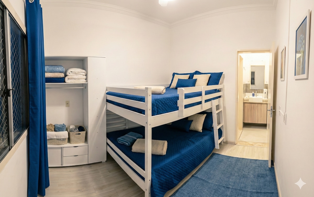 ✨ Apartamento completo, aconchegante e bem localizado em Jundiaí 📍 A apenas 4 min da Leroy Merlin, 10 min do Maxi Shopping, Centro e Jundiaí Shopping. 🛏️ 2 quartos com 3 camas para 4 pessoas (1 queen+2 de solteiro) 🍽️ Cozinha equipada: cooktop, geladeira, cafeteira, panelas, pratos e copos 🧺 Lavanderia com máquina lava e seca 🛋️ Sala com TV Smart 49" e projetor para cineminha em casa 🚗 Estacionamento gratuito 🏢 Condomínio com: ✅ Portaria 24h 🛒 Minimarket Quadra poliesportiva