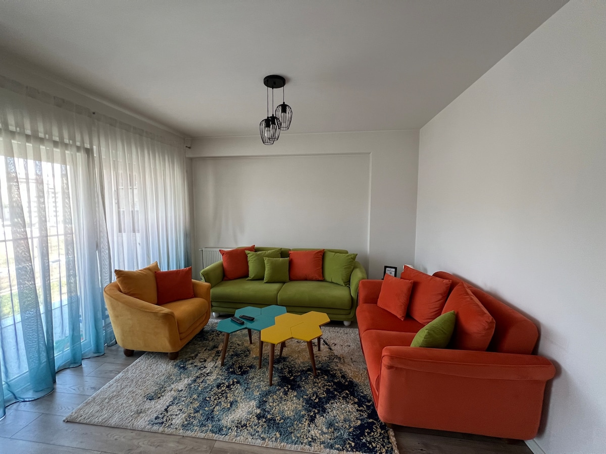 Stay cool with our new air conditioner! In the heart of Prishtina, just 10 mins from the main square, this bright apartment has a large terrace with city views, two modern bathrooms, three cozy beds, a fully equipped kitchen, and a spacious living room with comfy sofas and a 42" TV with Smart Box (Netflix,Hulu,Music) Perfect for relaxing, exploring, or working remotely in comfort and style!