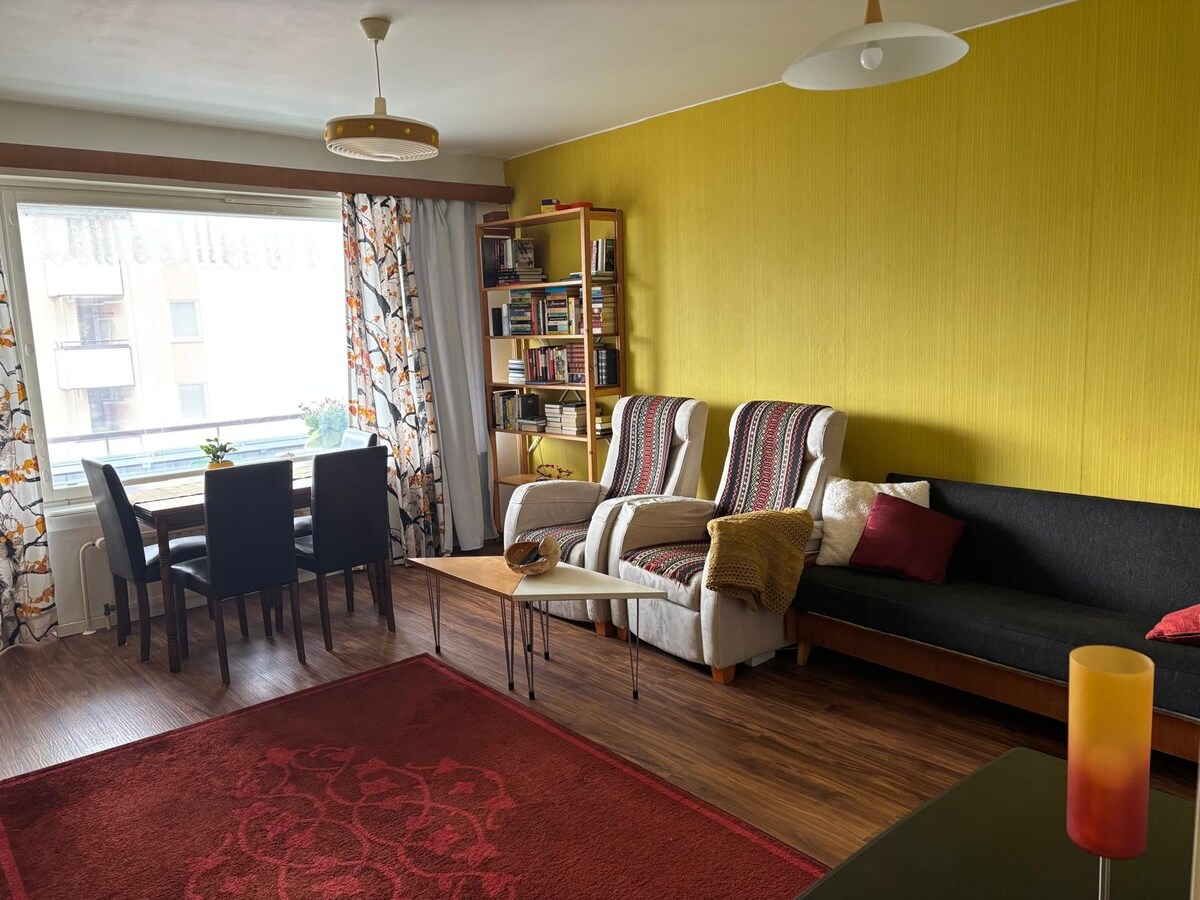 Bienvenido a este apartamento decorado en un estilo moderno de los años 50, perfecto tanto para estancias cortas como largas. 💥 Ubicación privilegiada justo en el centro de Jyväskylä, junto a Kirkkopuisto Departamento 💥 recientemente renovado con muebles nuevos, interior elegante y buen equipo 💥 Wifi (70-100 Mbit/s) Tamaño del💥 departamento: 46 m² Distancias a pie: - Centro de viajes a 10 minutos. - Centro de la ciudad a 7 minutos. - Tienda de comestibles a 5 minutos. -Universidad (edificio principal) a 15 minutos. -Universidad (Mattilanniemi) a 17 minutos. -Hippos a 25 min.
