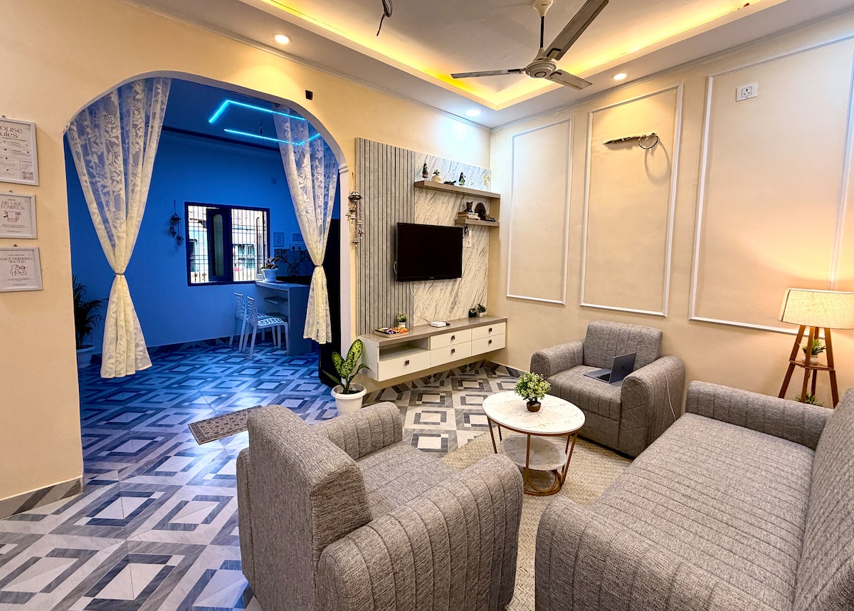 🌸 Spiritual & Peaceful Retreat • Calm, thoughtfully designed 1BHK in Varanasi's most sacred zone • Private bedroom, bathroom & dedicated study/work area • Kitchenette with induction & essential cooking utensils • Bright interiors in green, blue, yellow & off-white for peaceful energy • 350 m walk to Kashi Vishwanath Temple • 1 km to Dashashwamedh Ghat & Ganga Aarti • Steps from Ram Bhandar, Gopal Mandir & Kal Bhairav • Lift access, 2nd-floor apartment in a very prime location