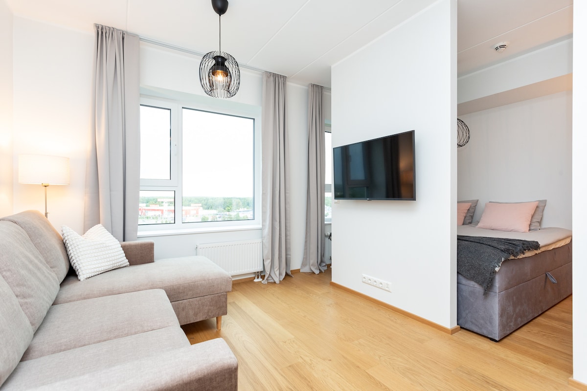 A new, bright & well designed apartment in Tallinn. Transportation to the city center takes about 15 min. , grocery stores, restaurants and shopping centers are located nearby. This cosy apartment is located on the 9th floor of a new building (2024). 1 parking spot in garage. Next to the house you will find a nice playground. The place has most of the things you may need: bed sheets, towels, dishes, cooking possibilities, coffee, tea, dishwasher, washing machine, iron, TV, free Wi-Fi.