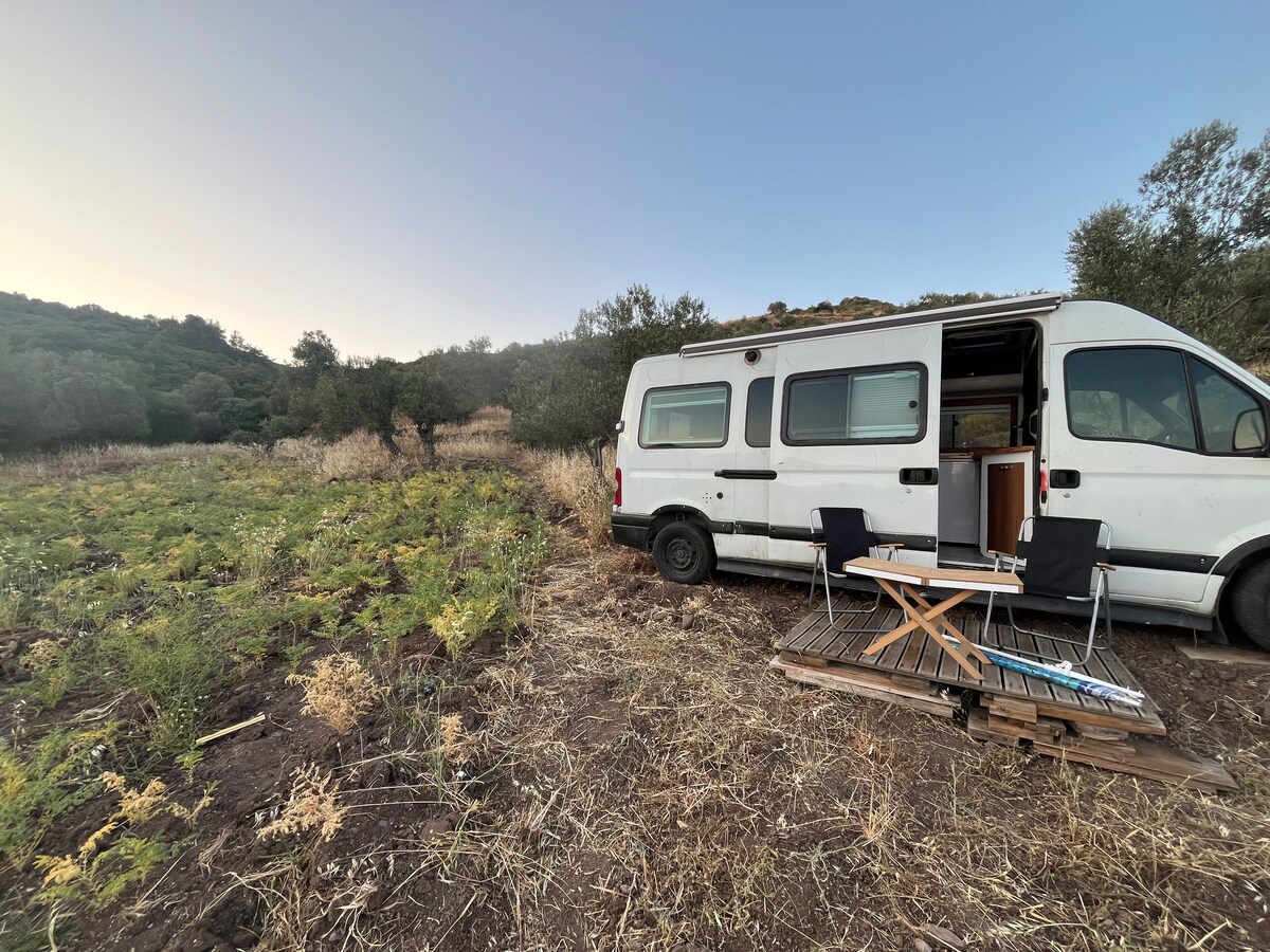 Una casa totalmente cerrada (fuera de la red) ubicada en un olivar. Toma su energía del sol y el agua de la lluvia. En primavera, el jardín está completamente cubierto con flores silvestres. En las elevaciones superiores del jardín y en la terraza frente de la casa, hay una magnífica vista de las Lesbos a un lado y la vista de la montaña y el valle al otro. Durante el día puedes hacer largos paseos por la naturaleza, puedes ir al mar a 5 minutos a pie. Puedes disfrutar despertando en una casa donde no puedes escuchar ruidos, excepto por los sonidos de los pájaros.