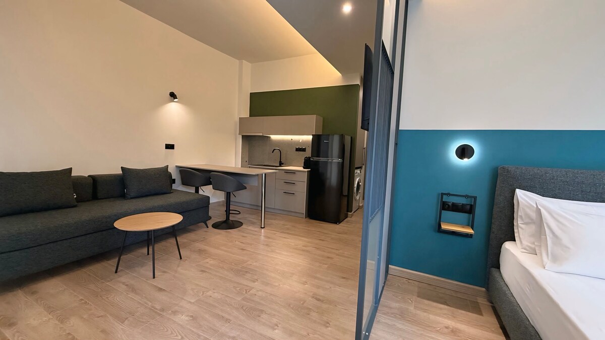 Disfruta de tu estancia en nuestro apartamento de nueva construcción (construido en 2023, clase energética A++). Es un estudio lujoso y cómodo junto al parque ferroviario y el puerto deportivo de la ciudad. Disfruta de la tranquilidad del barrio, la seguridad de una construcción moderna y crea hermosos recuerdos. Adecuado para una pareja. Cafeterías, panaderías, minimercado, supermercado y farmacias están cerca. Se encuentra a 7 kilómetros del aeropuerto de Kalamata.