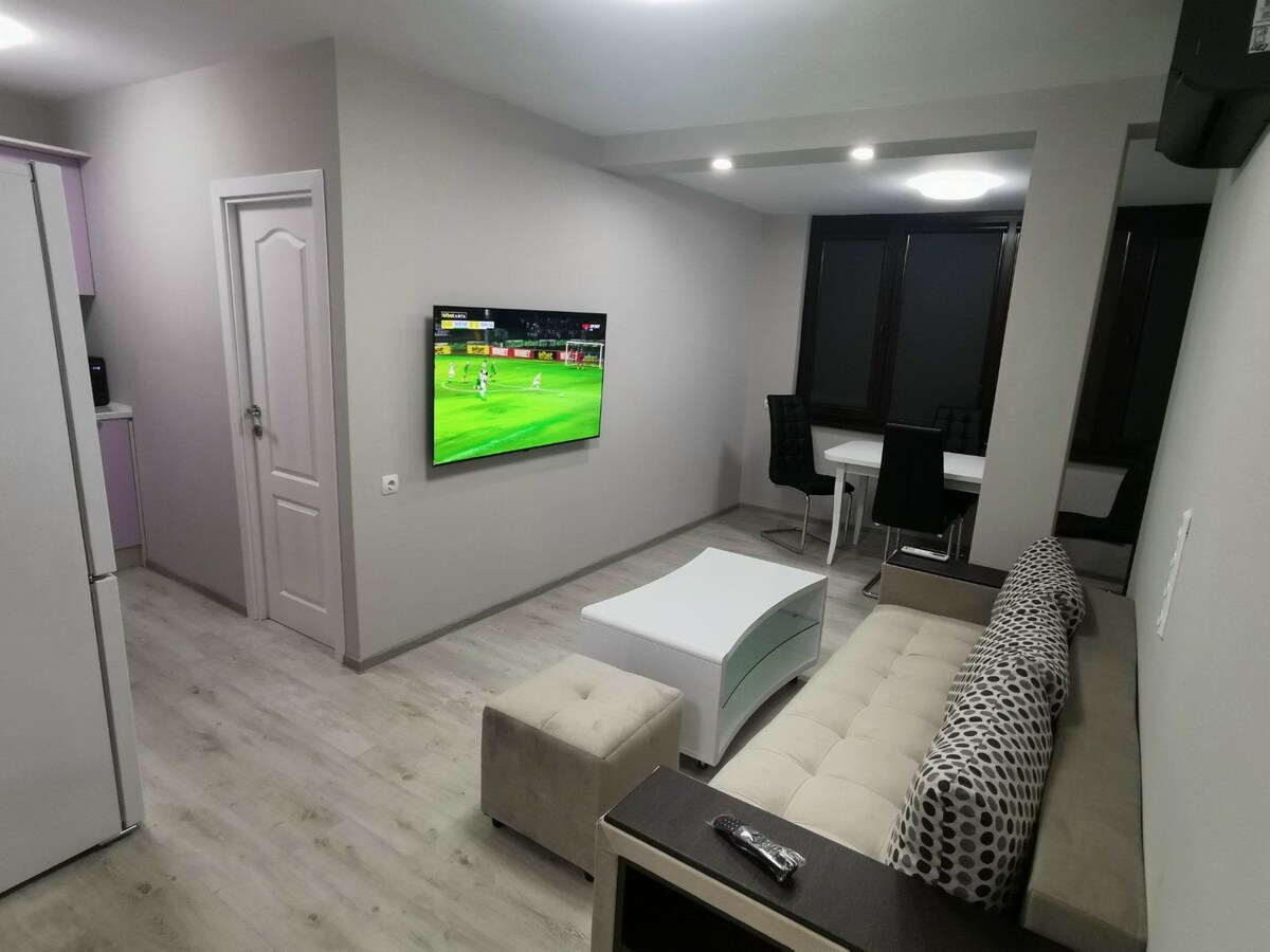 Acogedor y moderno apartamento a solo 5 minutos a pie de la playa en Burgas. Ideal para parejas, familias o trabajadores remotos. Cuenta con un amplio dormitorio, sala de estar con sofá cama, cocina totalmente equipada, balcón, aire acondicionado, wifi y lavadora. Cerca de tiendas, restaurantes y transporte público. Ideal para una estancia relajante junto al mar y una visita cómoda.