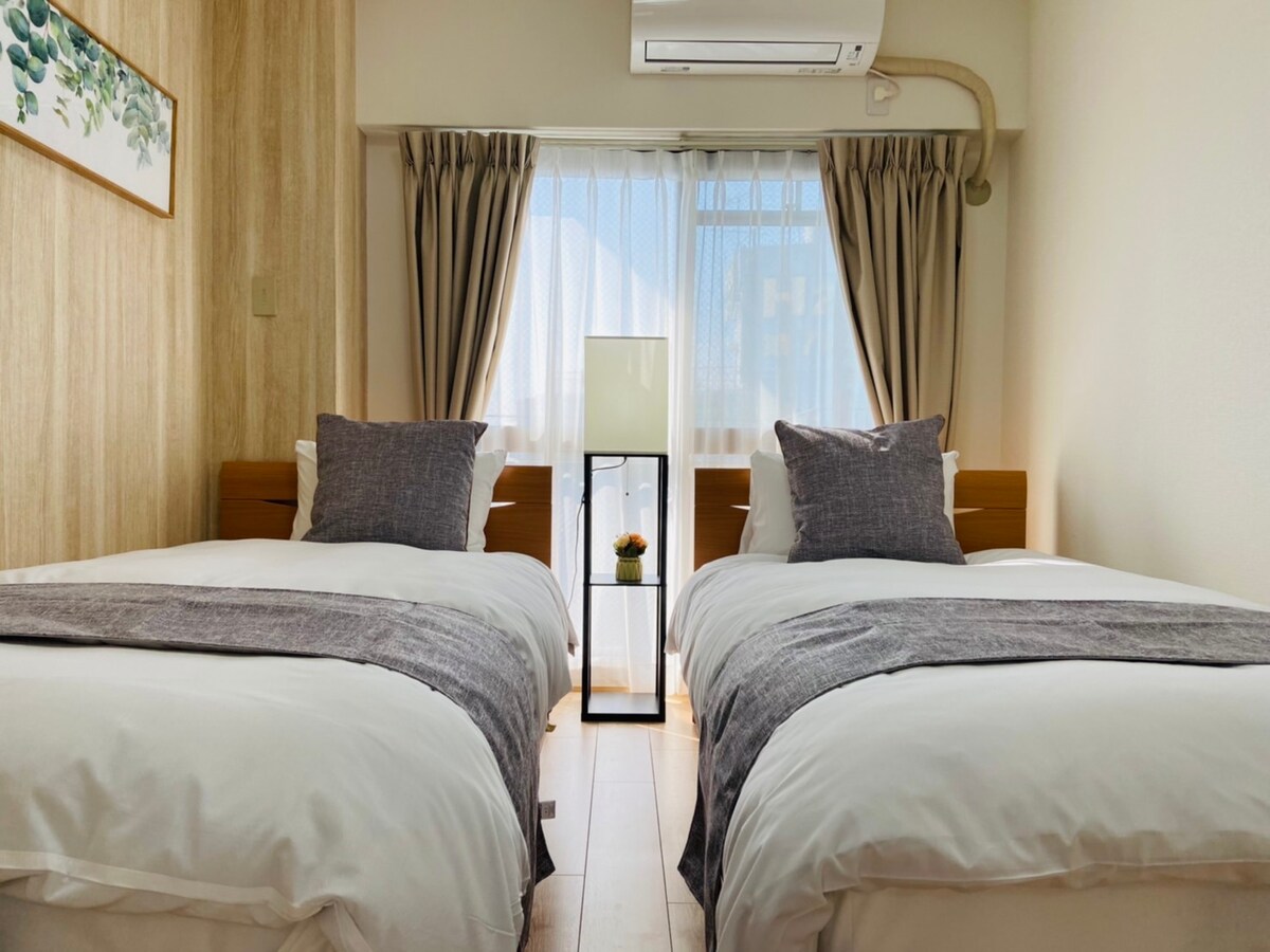 ◆Location: 1 subway stop from Namba, Dōtonbori, and Tennōji. 180m from Daikokucho subway, 2mins walk. ◆Facilities: Two double bedrooms Separate living area, kitchen, and bathroom. Fits up to 4 guests. ◆Transport: Access to Midosuji, Yotsubashi, JR Loop, and Nankai Line. Kansai Airport: 45 mins on Nankai Line, no transfers. Universal Studios: 25mins by JR. ◆Notes: 1 free towel/guest. Extras 200 yen. No cleaning during stay. Quiet after 10 pm. No smoking indoors.