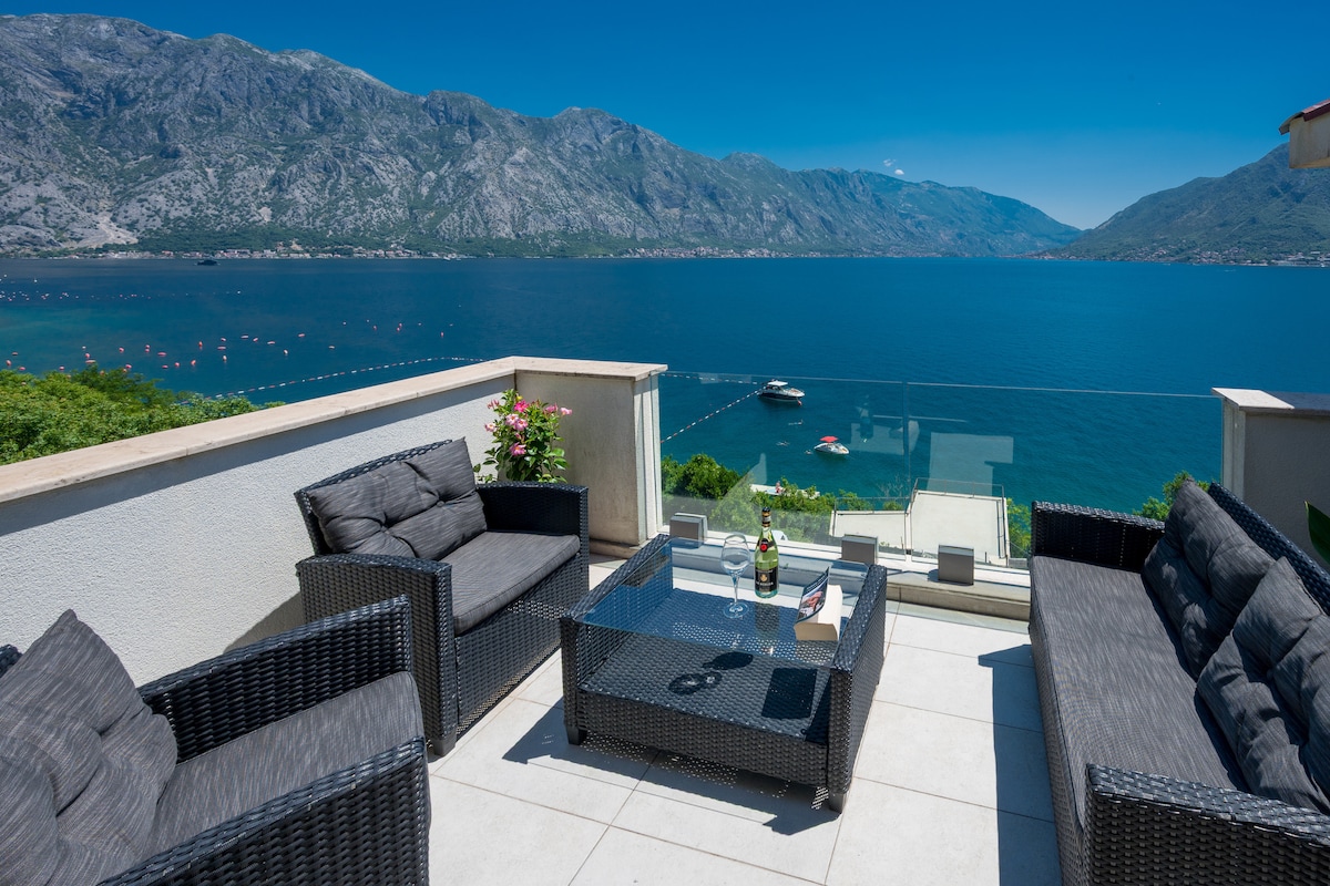 La casa, que está literalmente a diez pasos del mar. Dentro de la escalera de caracol conduce a la sala de estar del último piso, que conduce a una terraza abierta con vistas directamente a la isla «señora de la roca». Transporte público: servicio de autobús entre Kotor y Risan. El más cercano es Tivat en Montenegro (a media hora en coche de Perast). Hay muchos restaurantes a lo largo de la Riviera.