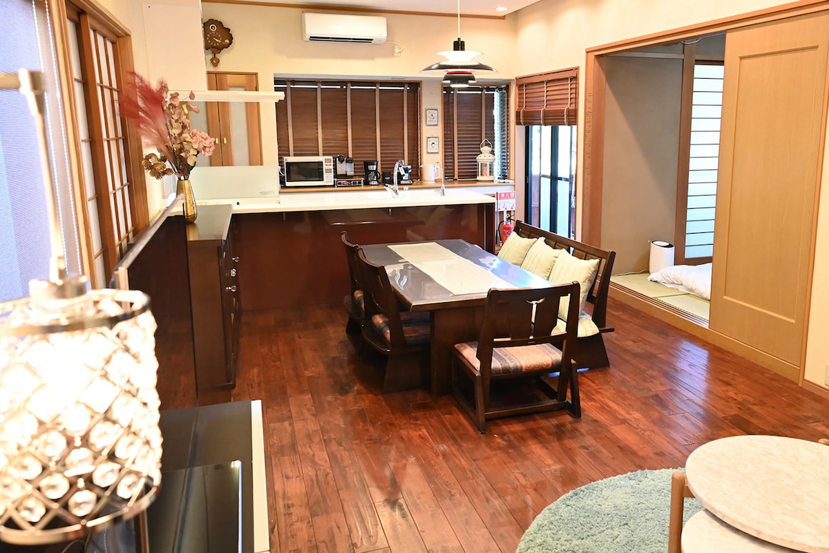Enjoy a fully private stay in a traditional Japanese house, reserved just for you. Perfect for a romantic getaway or a quiet escape with loved ones. A fully equipped kitchen and spacious dining area offer comfort, while the living room and bedrooms are designed for privacy and relaxation. Free parking and contactless check-in allow flexible arrival, even late at night. Where even silence becomes music—enjoy a peaceful, refined night.