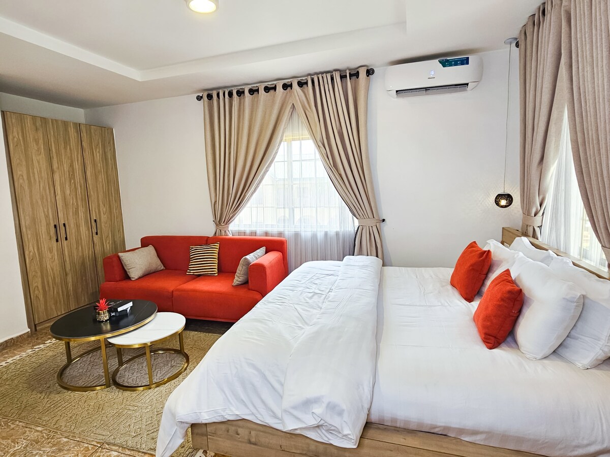 Escápate del ajetreo de la ciudad en este acogedor y elegante apartamento tipo estudio. La estética contemporánea de este espacio es perfecta para escapadas en pareja o viajeros solitarios. Está totalmente amueblado y ubicado en una finca segura. El espacio cuenta con wifi gratuito y superrápido y un amplio espacio de estacionamiento. La cocina está equipada con equipos modernos para tu comodidad. Con electricidad las 24 horas, los 7 días de la semana, nuestro televisor inteligente y otras lujosas comodidades hacen de este un hogar lejos de casa, con las comodidades de una suite de hotel de ensueño.
