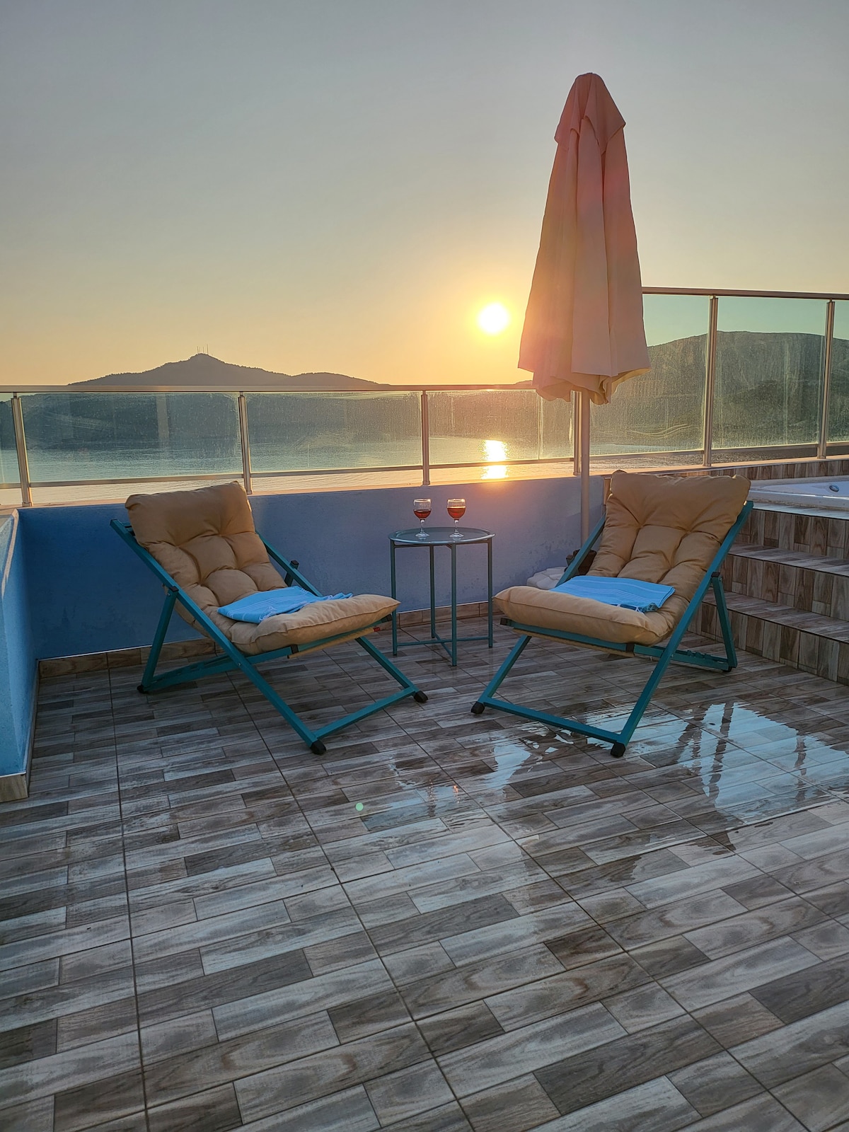 Relájate en esta escapada única y tranquila. La villa frente a la calle está a solo unos pasos de 1 dormitorio con 2 camas individuales, incluida la suite. sala de estar/área de entretenimiento, comedor y cocina. Las escaleras te llevan hasta el ático de la azotea, que tiene una cama tamaño king europea de 200 cm x 160 cm con su propio baño privado. Una gran puerta se abre al balcón con zona de tumbonas y jacuzzi para disfrutar de las vistas ininterrumpidas al mar.