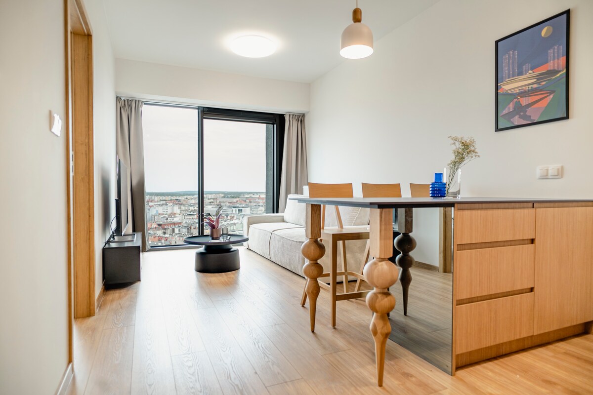 Soleado y cómodo apartamento en el primer distrito. ¡Impresionantes vistas desde el décimo piso! Más de 100 m2 de espacio (incluidos 20 m de terrazas): 2 dormitorios privados con cerradura para dormir y trabajar, más 2 lugares más para dormir en la sala de estar. Perfecto para solteros, parejas y viajeros de negocios con o sin familia. Excelente ubicación cerca de Spodek, NOSPR y el Centro de Congresos. El edificio cuenta con una tienda de comestibles, barbería, salón de masajes tailandés y Wine Taste by Kamecki.