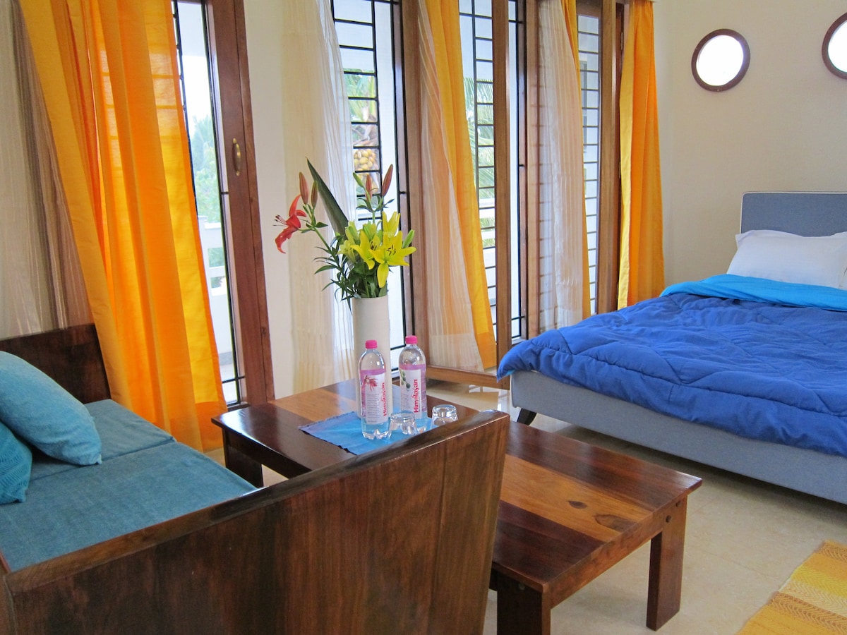 Primera planta, una habitación con aire acondicionado (cargos adicionales basados en el uso real de aire acondicionado) con 2 camas y colchón Sleepwell, con baño privado, agua caliente las 24 horas, batería de respaldo UPS solo para luces y ventiladores (durante aproximadamente 4 horas), wifi de fibra, nevera, pequeña cocina con cocina de GLP de un solo quemador, pocos utensilios, hervidor eléctrico, lavadora, punto de carga de vehículos eléctricos.
