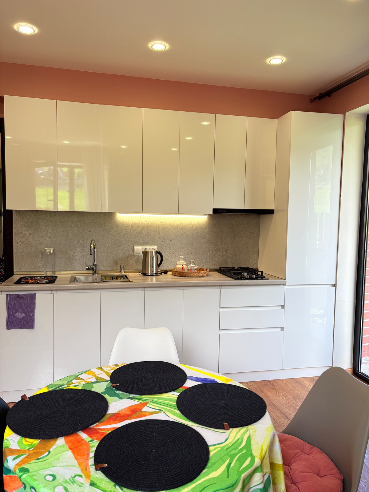 El elegante apartamento Kazbegi se encuentra en la base de la montaña Kazbek en el pueblo de Stepantsminda, a 7 km de la iglesia Gergeti del siglo XIV. El espacioso departamento es completamente nuevo y está decorado con muebles de madera y enormes ventanas llenas de sol con vistas a la impresionante Iglesia de la Trinidad Gergety del siglo XIV y al monte Kazbegi. Tienes estas vistas incluso desde tu cama. Cocina recién equipada, todo de moda...Lleva a toda la familia a este elegante lugar con mucho espacio.