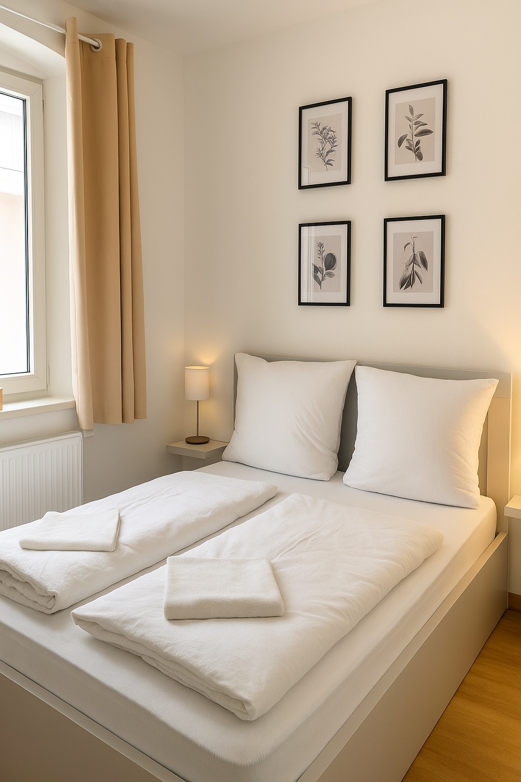 Un gran dormitorio y comedor que comienza la pequeña cocina y el baño recién renovado. Cama de 1,40 m, escritorio pequeño, TV (solo a través de Internet) y wifi. Baño nuevo con ducha a ras de suelo y mucho espacio. Cocina totalmente equipada con fogones, horno, nevera/congelador, microondas, lavavajillas, cafetera Nespresso, etc. El apartamento no incluye plaza de aparcamiento. Sin embargo, hay un aparcamiento público (Burgstraße 20) a dos calles de distancia por unos 20 euros al día.