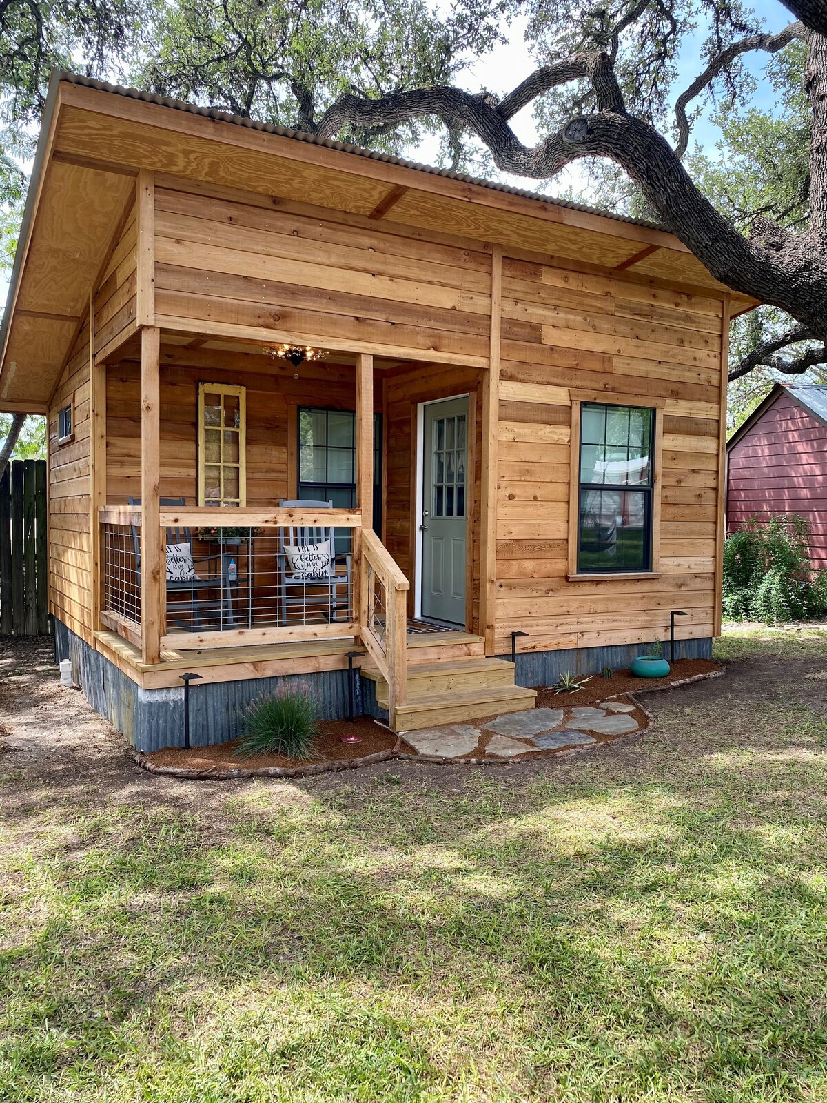 Esta adorable casita está perfectamente situada entre 2 preciosos robles de gran tamaño. Ven a pasar el rato en el gran columpio, a solo unos pasos de la puerta de tu cabaña, y disfruta del ambiente tranquilo donde es fácil ver las estrellas. O pasa el rato en tu porche delantero y mece el día o la noche. Esta escapada única y tranquila se encuentra en un terreno de un acre compartido con una casa histórica construida en 1883 y otros 2 lugares pequeños. Cocina americana/parrilla/fogata/hamacas. Situado a menos de 1 milla de Maine Street Boerne.