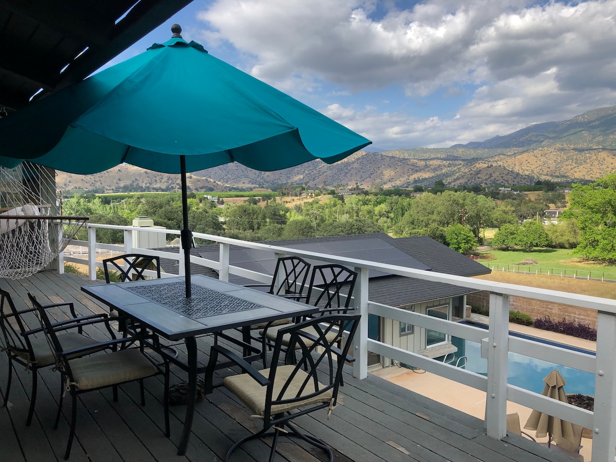 Ubicado en las estribaciones de las Sierras y en el borde del Parque Nacional Giant Sequoia, este rancho ganadero de 107 acres tiene una belleza rara que todos disfrutan. Disfruta de tu café en el balcón de tu casa de campo y relájate con la energía pacífica del estanque, los pastos, las montañas y la puesta de sol. Tenemos rutas de senderismo, ciclismo y equitación y 10 hoyos de golf de disco para jugar. Visita Success Lake, el río Tule o el casino. También disponemos de otras 2 unidades de alquiler (suite privada y casa rancho) para amigos/familiares.