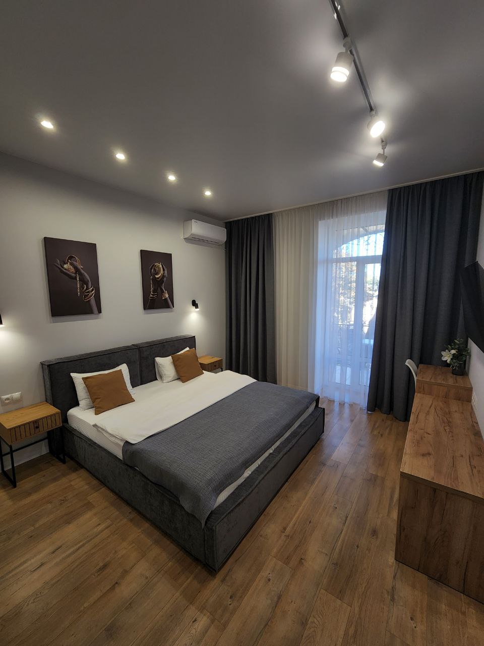 Stylish riverside apartment in Riviera complex with panoramic Southern Bug River views. Watch sailing boats while enjoying espresso from the De'Longhi machine. Features: open-plan living with fireplace & Smart TV, fully equipped kitchen, king-size bed with AC, modern bathroom, workspace. Safe, quiet area with fresh air. Sandy beach with café nearby. Free parking. Supermarket & pharmacy — 3 min walk. Washer, hairdryer, bathrobes, slippers, linens included.