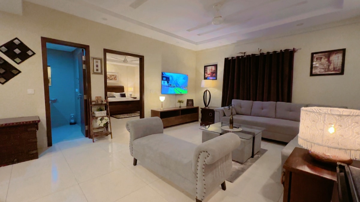 Lujoso 2BHK en Zeta Mall | Diseñador 2BR con vistas al atardecer y a Margalla Entra en este espacioso apartamento de 2 dormitorios con dos camas tamaño «king», balcón privado con asientos al aire libre, televisor inteligente de 55" y wifi de 30 Mbps. Disfruta de una cocina totalmente equipada, aire acondicionado con inversor, agua caliente y una decoración moderna para una estancia perfecta. Ubicado sobre la zona de restauración del centro comercial Zeta y a pocos pasos del centro comercial Giga, a minutos de DHA y de la autopista, perfecto para familias, viajeros de negocios y escapadas de fin de semana. Se requiere CNIC 18+. No se permite fumar ni hacer fiestas.