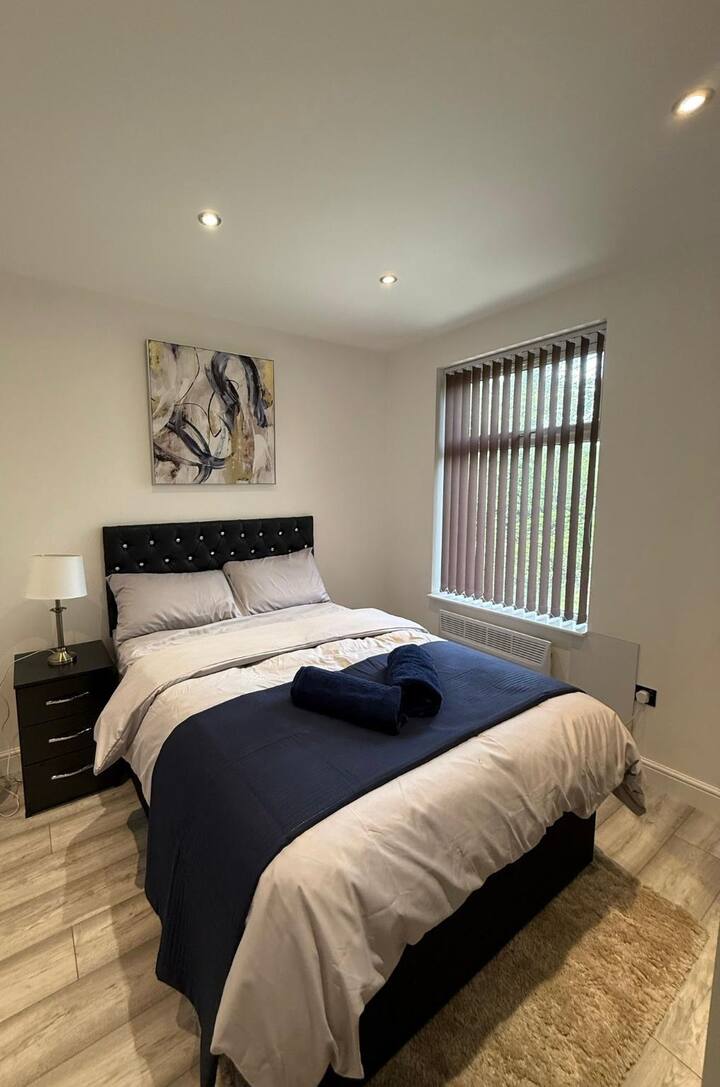 Private guest house with private separate entrance. Double bedroom with en-suite bathroom. Fully functioning workspace. TV(Netflix,Amazon prime, Disney+). Very fast WiFi. 5 minutes walking distance from Glenfield hospital. 10 mins by car from Leicester City Centre. No full kitchen (no cooker but microwave, toaster, kettle and mini-fridge provided). Property is part of a larger property and is situated on first floor with its own private entrance. No lift.