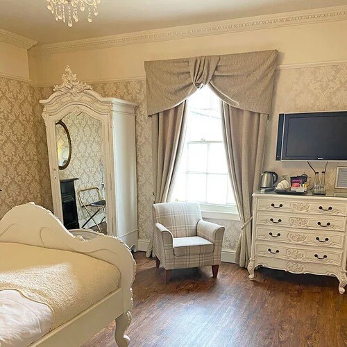 Recientemente decorado y amueblado para 2021, entra en su suite privada en la planta baja, caminando directamente a la nueva cocina bellamente equipada completa con electrodomésticos, elegante comedor perfecto para cenas románticas relajadas y acogedoras con velas. Arriba entrarás en tu cálida sala de estar con un pequeño balcón con vistas al parque Baysgarth, amueblado con sofá y sillas a juego, iluminación suave y una televisión inteligente que conduce al dormitorio con su suntuosa cama francesa antigua y baño privado.
