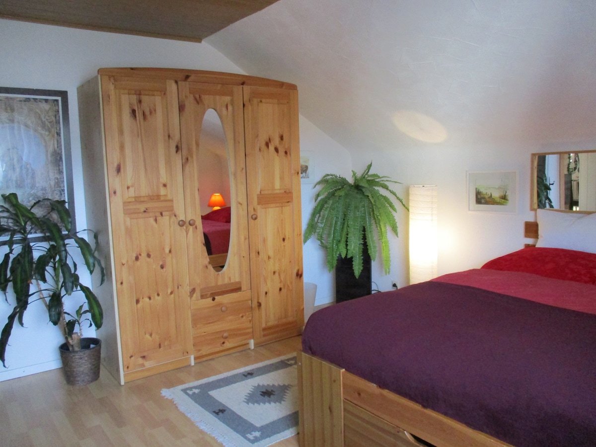 Nuestras habitaciones en el piso superior tienen su propia entrada, baño y un gran balcón que te invita a tomar el sol desde el mediodía hasta la noche. Con solo 38 m² adecuado para estadías más largas para 1-2 personas. Una parte del apartamento es utilizada por nosotros como oficina, pero la mayoría de las veces no te molestaremos. Refrigerador, mesa de comedor, cafetera, tostadora y hervidor de agua están disponibles. Nuestra cocina puede compartir.