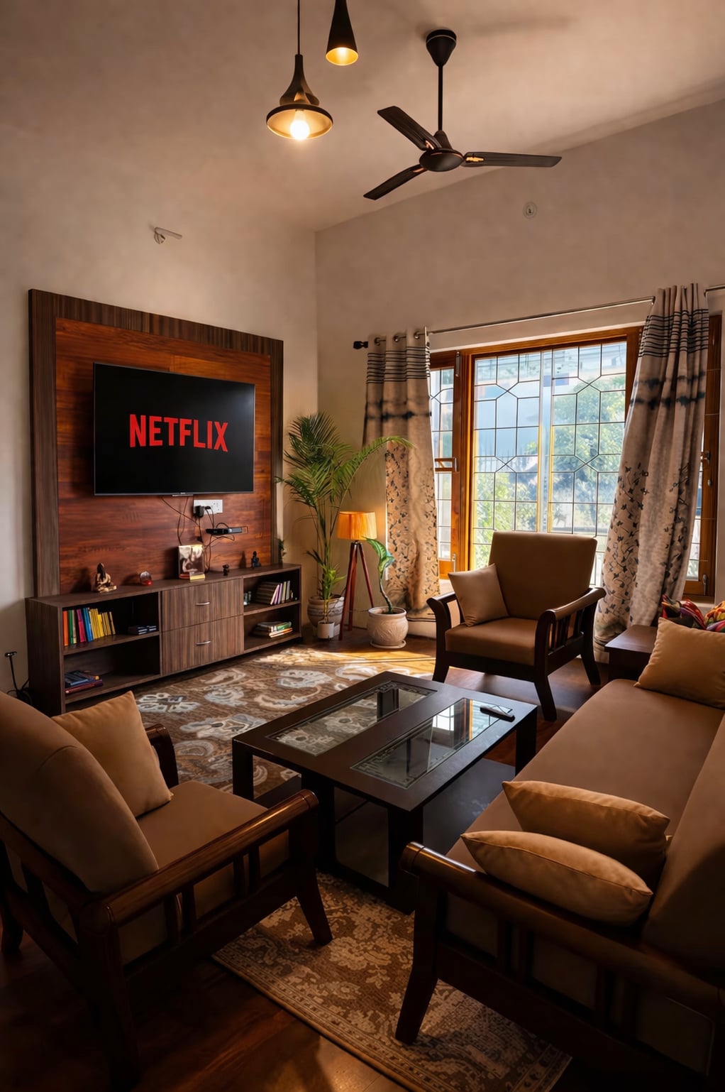 This Dehradun Mussorie home offers quiet premium and everyday comfort. A 2BHK concept with Dehradun-Mussorie valley view, kept it for Workation ready with mountain and Doon-valley view. Suggested stay in Dehradun-Mussorie Premium & thoughtfully curated furnishing layout create a space that feels both refined and welcoming. We dressed up this home in trendy way, ideal for guests who value privacy, comfort, simplicity and perfection. Designed in warm beige tones with a calm, minimal aesthetic.