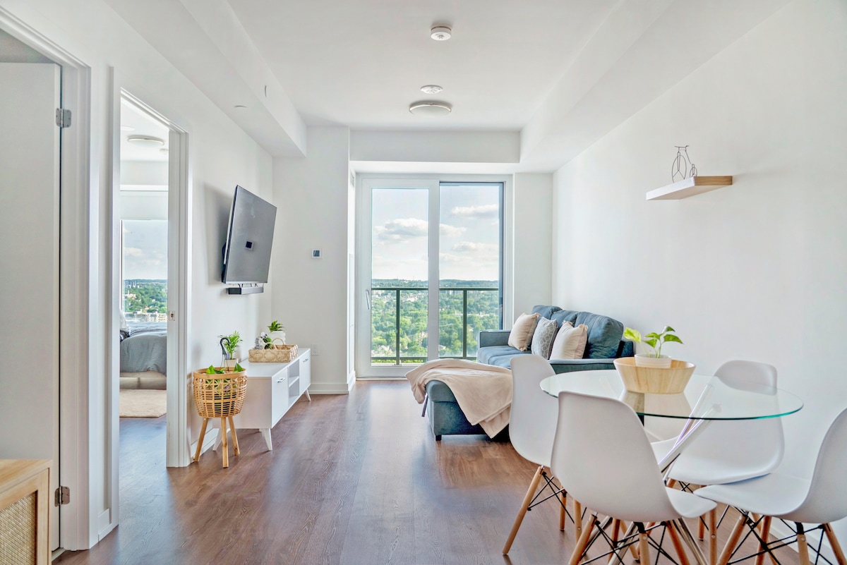 Te damos la bienvenida a tu escapada a las alturas. Ubicado en la planta 21 en el corazón de Kitchener Waterloo. Este elegante apartamento de 1 dormitorio ofrece impresionantes vistas, una cómoda cama tamaño queen, una cocina completa con electrodomésticos de última generación. Las instalaciones del edificio incluyen gimnasio, piscina, salón y terraza con barbacoa. Tanto si estás aquí por trabajo como por placer, te sentirás como en casa.