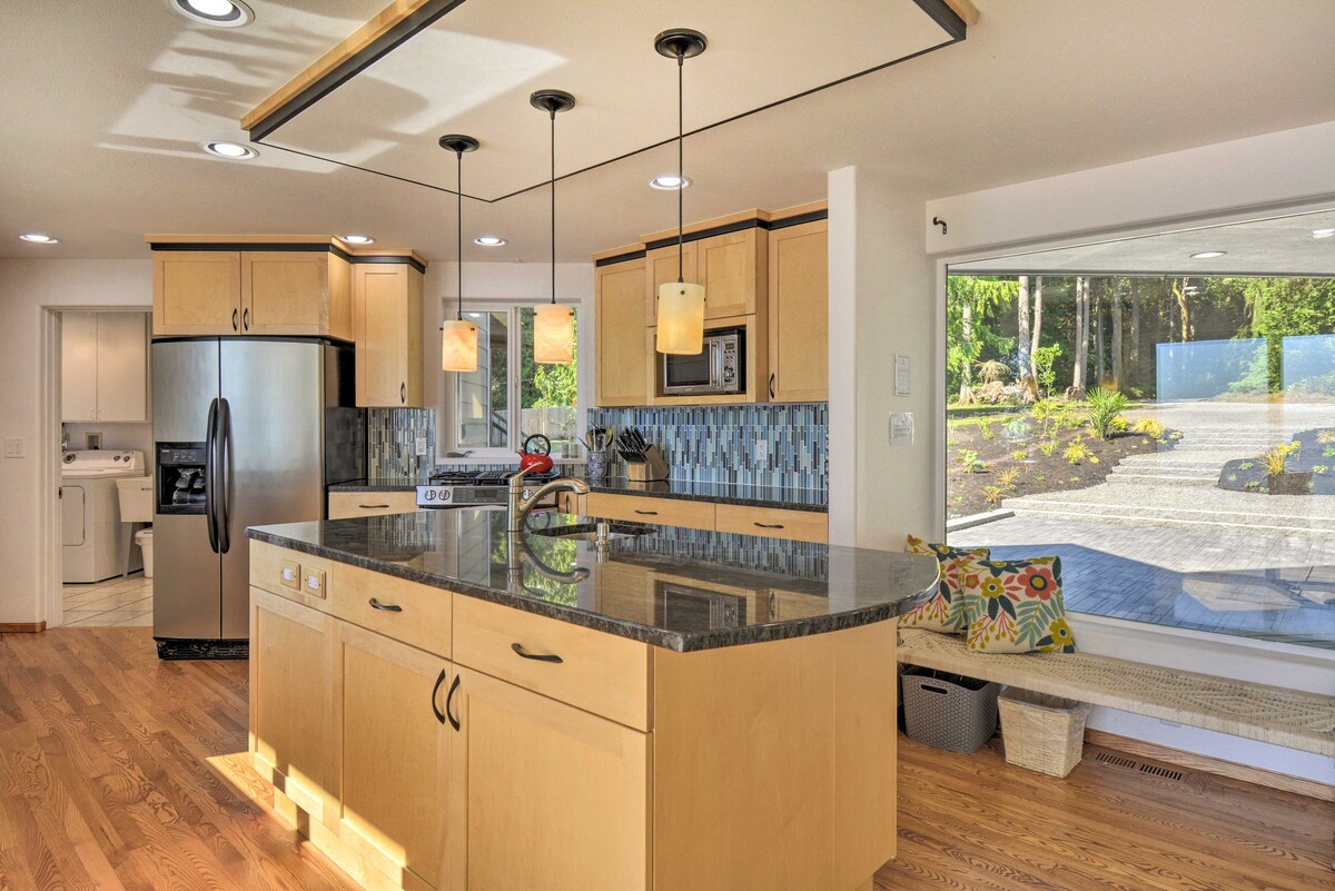 Nurture your spirit with a stay at this Poulsbo vacation rental! Dubbed the Little Norway of Washington, this 3-bedroom, 2.5-bathroom house offers a quiet place to stay between adventures. Watch your favorites on the flat-screen TV, refuel with a warm meal made in the kitchen, or take in the mountain views from the backyard. For easy city access, walk onto the ferry for a scenic 30-minute ride to Seattle — then just a 5-minute stroll from the terminal to the FIFA stadium. Book today!