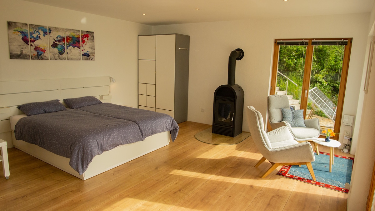 Construimos la Villa Azul para hacer feliz a la gente: primero a nuestros hijos y ahora a nuestros huéspedes, que disfrutan del ambiente increíblemente tranquilo y de las impresionantes vistas de la ruta del vino. El apartamento en el sótano ofrece 50 metros cuadrados de espacio habitable para parejas que quieren estar a solas. Una cama tamaño king invita a acurrucarse. Una cocina sencilla completa el ambiente cuidadosamente diseñado. Bajo el follaje de los viejos robles se encuentra su área exterior privada de unos 100 metros cuadrados.