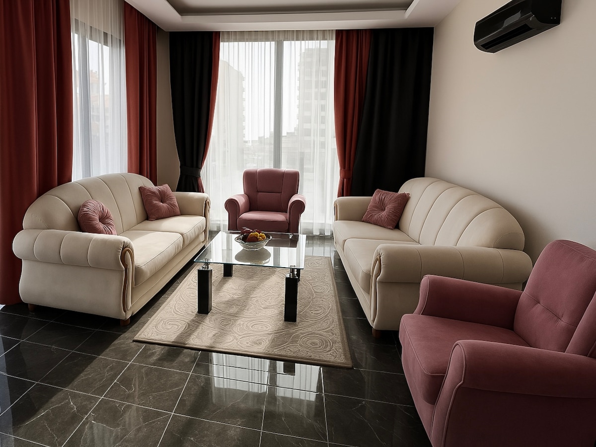 Apartment near Kleopatra Beach. The apartment is located in the heart of Alanya, just a few steps from the famous Kleopatra Plajı. One of the best locations in the city: a beautiful seaside promenade with bike paths, sports and children’s playgrounds, green park areas with fountains, Alanya Aquapark, cafés and restaurants — all right at your doorstep. Perfect for holidays, winter stays, remote work, or comfortable living by the sea. Beach, city center, and vibrant atmosphere — just steps away.