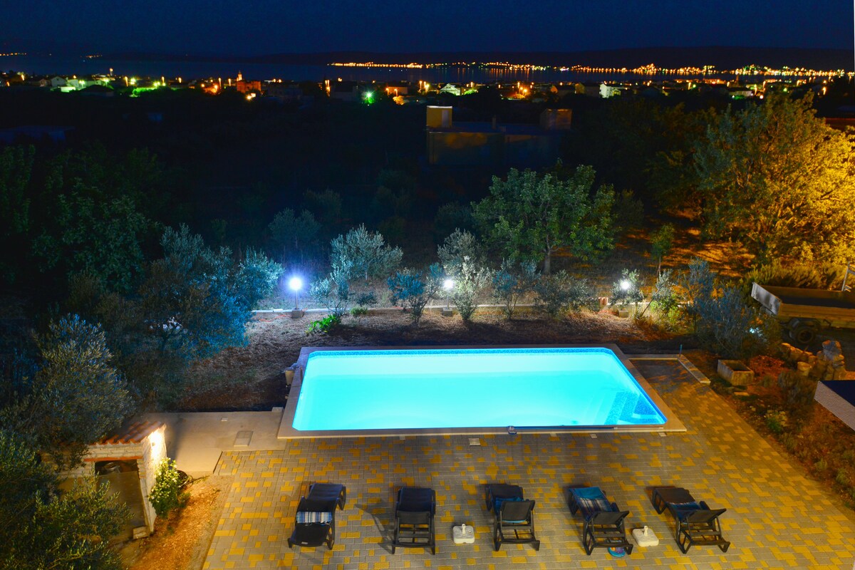 Esta espaciosa villa (4000 metros cuadrados) con una gran piscina (12 metros de largo/72 metros cuadrados) se encuentra en una zona tranquila en una colina, a solo 10 km del centro de Split y las playas, con vistas panorámicas a la ciudad de Split y las islas. La villa está rodeada de olivos, vides e higueras tradicionales, y también tiene terraza cubierta con barbacoa, parque infantil y estacionamiento privado. Es un paraíso para los amantes de la naturaleza que buscan una escapada a la ciudad y es perfecto para familias con niños pequeños.