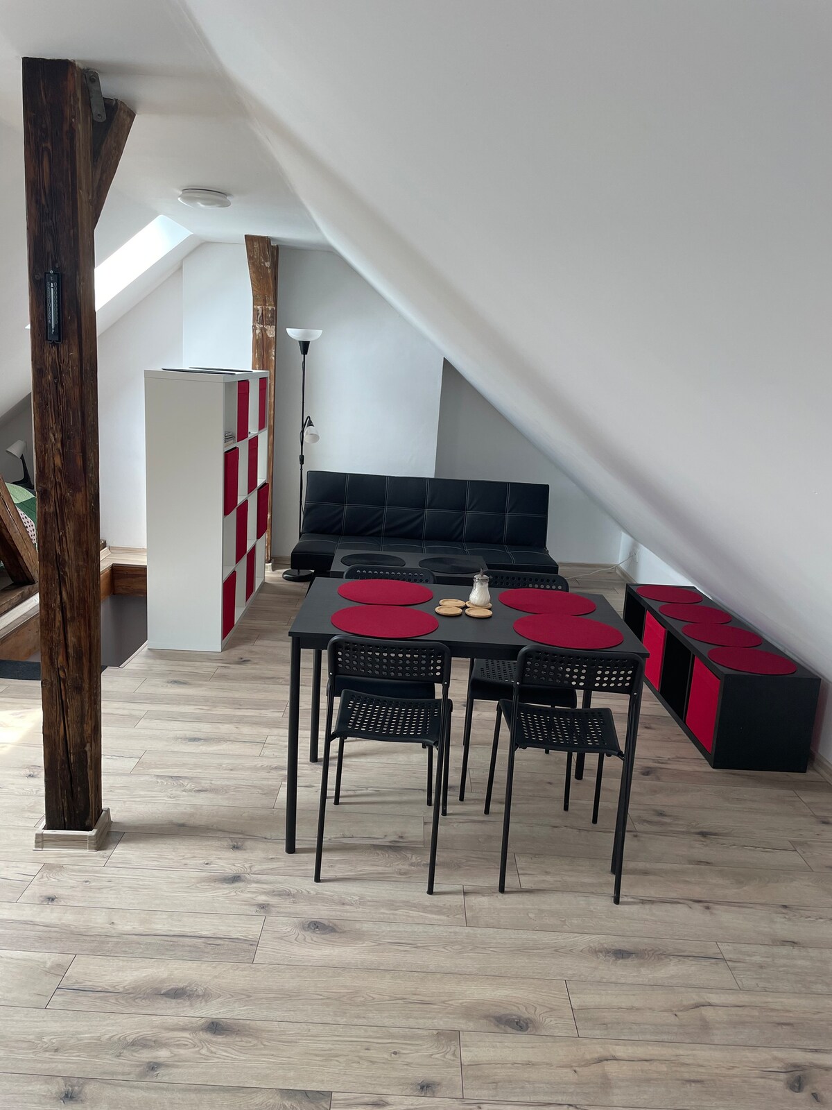 Apartamento soleado en un ático en una parte tranquila de la ciudad cerca del centro y del bosque. El dormitorio ofrece una cama doble con un tamaño de 2x2m. Hay un sofá en la sala de estar, que se puede ampliar a un tamaño de 190x150 cm y permite que dos personas más duerman. En el salón hay una cocina con estufa, lavabo, platos. El departamento cuenta con wifi y dos televisores. El baño tiene una pequeña sauna de madera para un máximo de 2 personas. El inodoro es independiente. Estás en el centro en 5 minutos a pie.