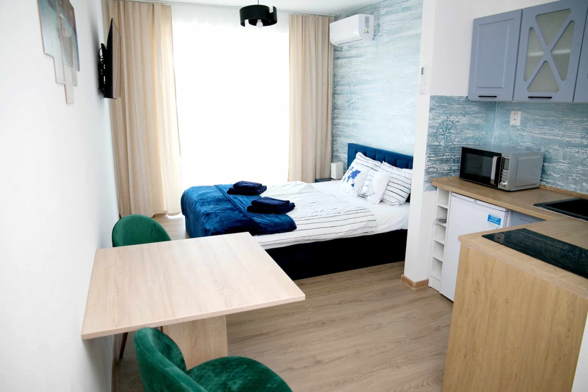 Štýlový a nový jednoizbový apartmán s kúpelňou so sprchovým kútom a plne vybavenou kuchyňou sa nachádza na prízemí tehlovej stavby v tichej a príjemnej lokalite. V bezprostrednej blízkosti nájdete potraviny, reštaurácie, kaviarne v centre mesta, termálne kúpalisko, fitness aj park. Apartmán je plne zariadený, ideálny na oddych aj pracovný pobyt.