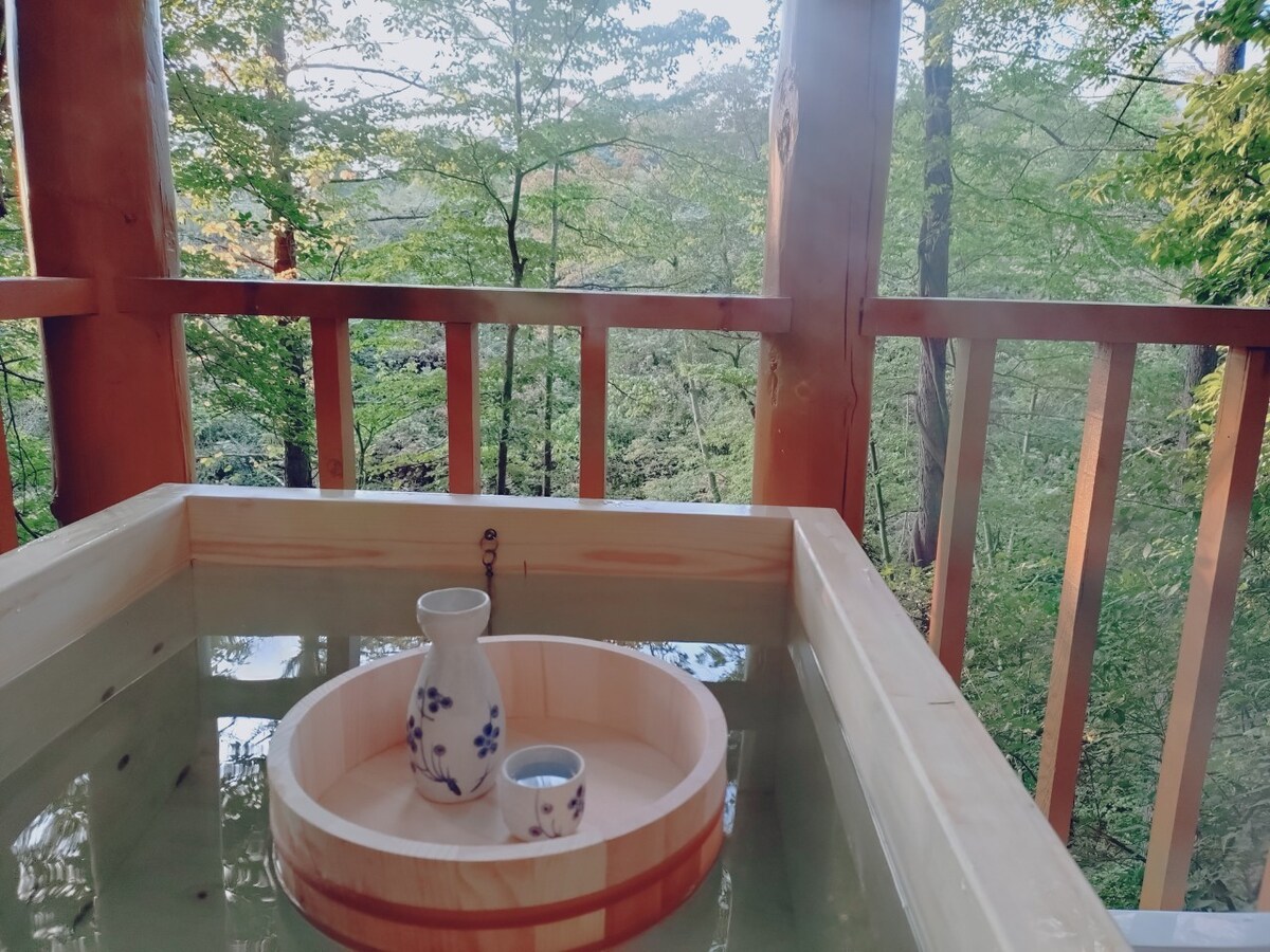 ¡Cocina al aire libre! Disfruta del canto de los pájaros, de la tranquilidad y de la belleza de la naturaleza. Incluye un boleto para el onsen Aguri.