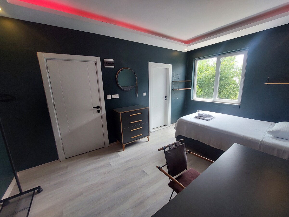 Bu 2+1 daire, 5 kişilik konaklama kapasitesi sunar. İki çift kişilik yatak odası ve geniş bir oturma alanı bulunur. Modern tasarıma sahip daire, geniş balkonu, doğalgazlı ısınma sistemi ve tam donanımlı mutfakta ocak, fırın, bulaşık makinesi ve çamaşır makinesi ile konfor sağlar. Otobüs durağı ve yerel pazar yakındır; denize ise 50 metre mesafededir. 7/24 resepsiyon ve güvenlik kameraları güvenliği artırır. Şehir merkezinde rahat bir konaklama için ideal!